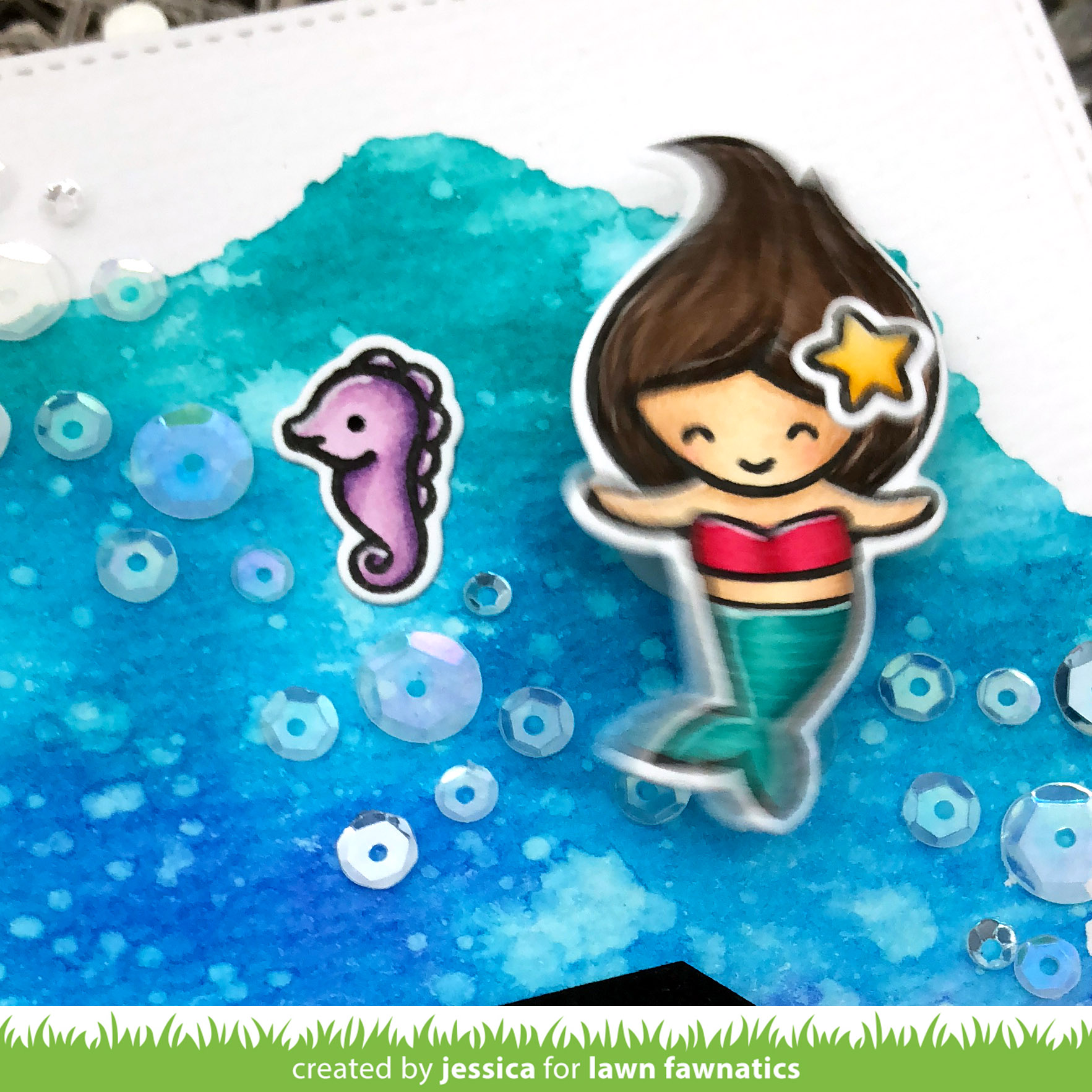 Good morning!! It’s time for a new Lawn Fawnatics challenge and we’re challenging you to create a scene of your favorite place!! For me it was a no brainer, I LOVE the ocean! And of course I’d love to be a mermaid with a sparkly seahorse bestie! Who wouldn’t!? 😉