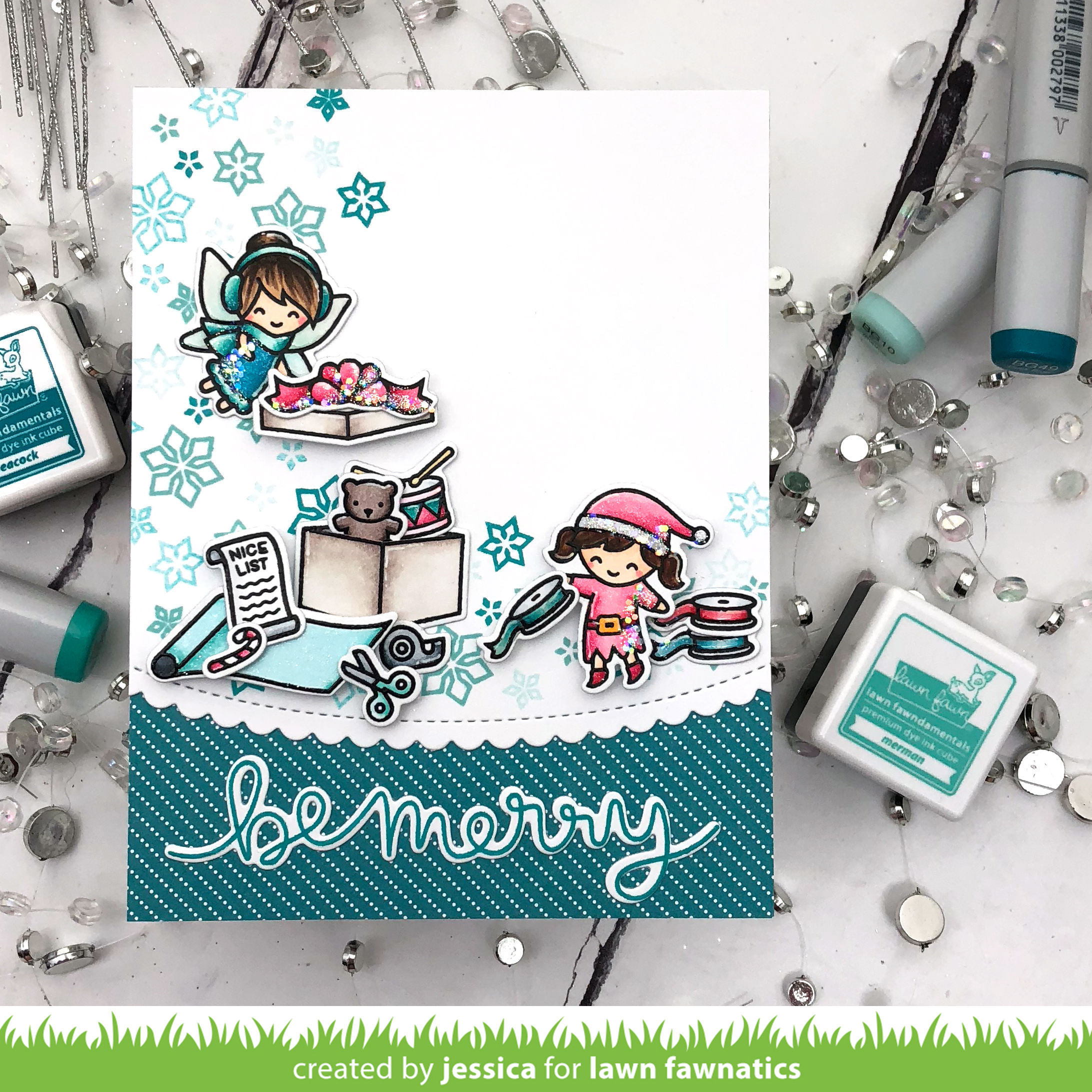Next I die-cut a scalloped border from white cardstock and adhered it over a piece of patterned paper from the OLD (ha) Beachside patterned paper pad. Then I stamped a few snowflakes using teal inks from Lawn Fawn and adhered my images using a combination of regular adhesive and foam mounting tape. Finally I stamped my sentiment, die-cut it with the coordinating die and adhered it to the card!