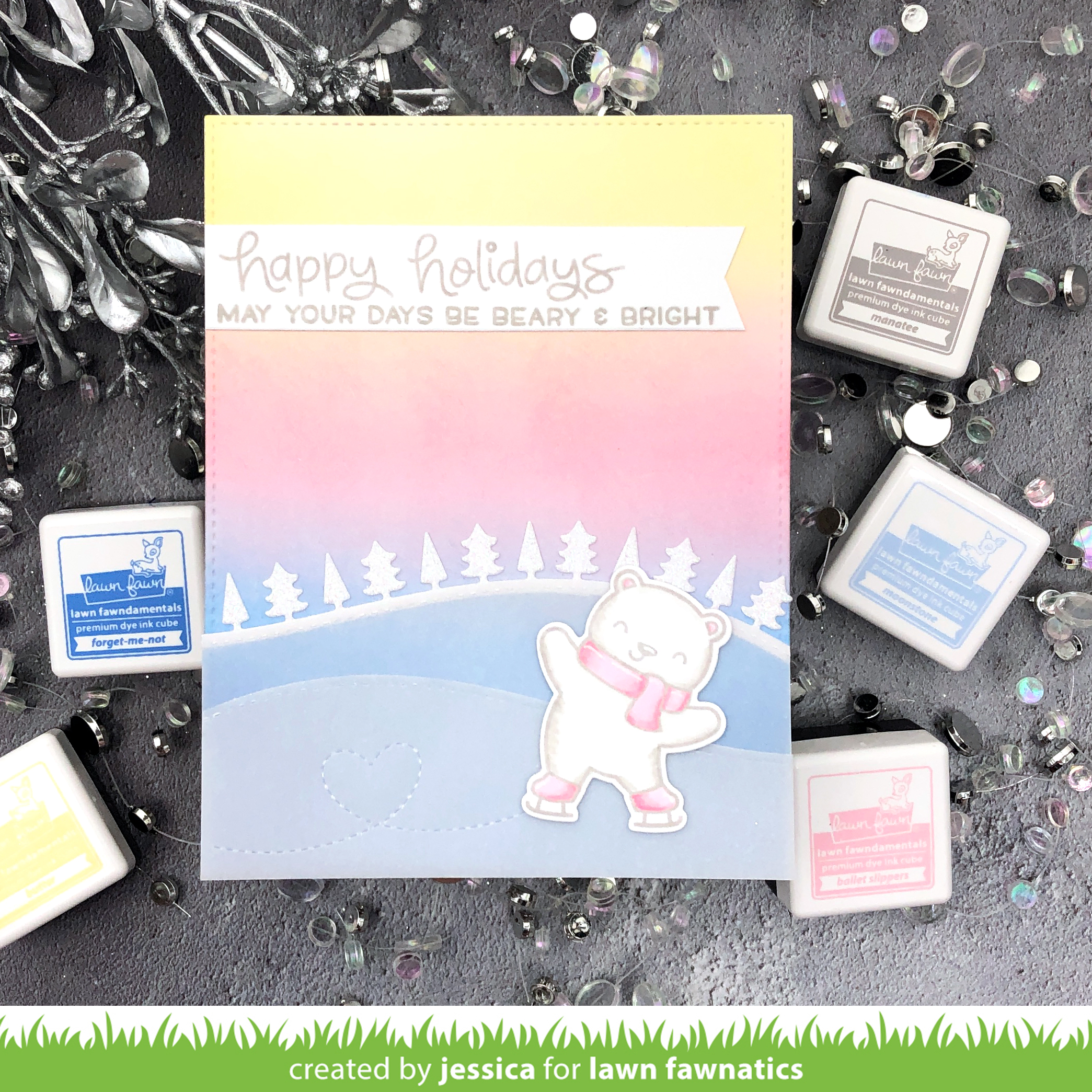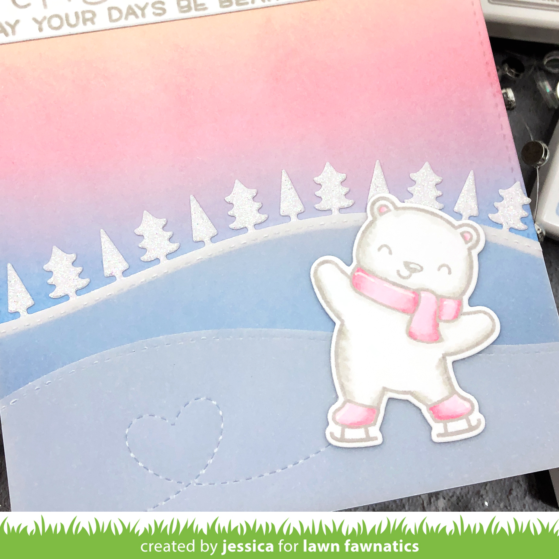 To start I blended Butter, Ballet Slippers, and Moonstone Lawn Fawn ink onto a piece of strathmore bristol cardstock to create a sky. Then I die-cut the Forest Border die with white glitter cardstock and trimmed along the stitched line. I die-cut two hills with vellum die-cut the smaller one with the Stitched Trails heart die before scoring the ends. I folded the flaps behind the panel and adhered them behind the panel so the adhesive wouldn’t show. Then I adhered the forest border behind the hill to show the break between the sky and the ice.