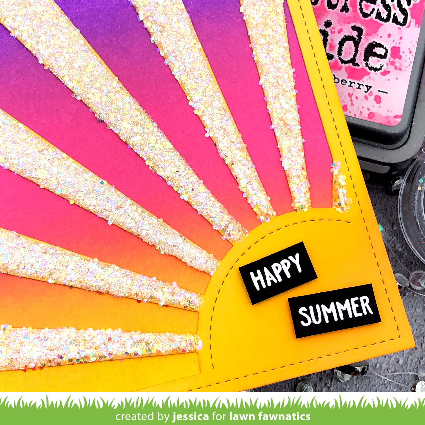 And, of course, you know me and glitter! 😉 I added a layer of crystal glaze to each sunray and sprinkled it with chunky and prisma glitter. I let that dry for a few hours and then added a sentiment from On the Beach stamped and heat-embossed on black cardstock to finish the card!
