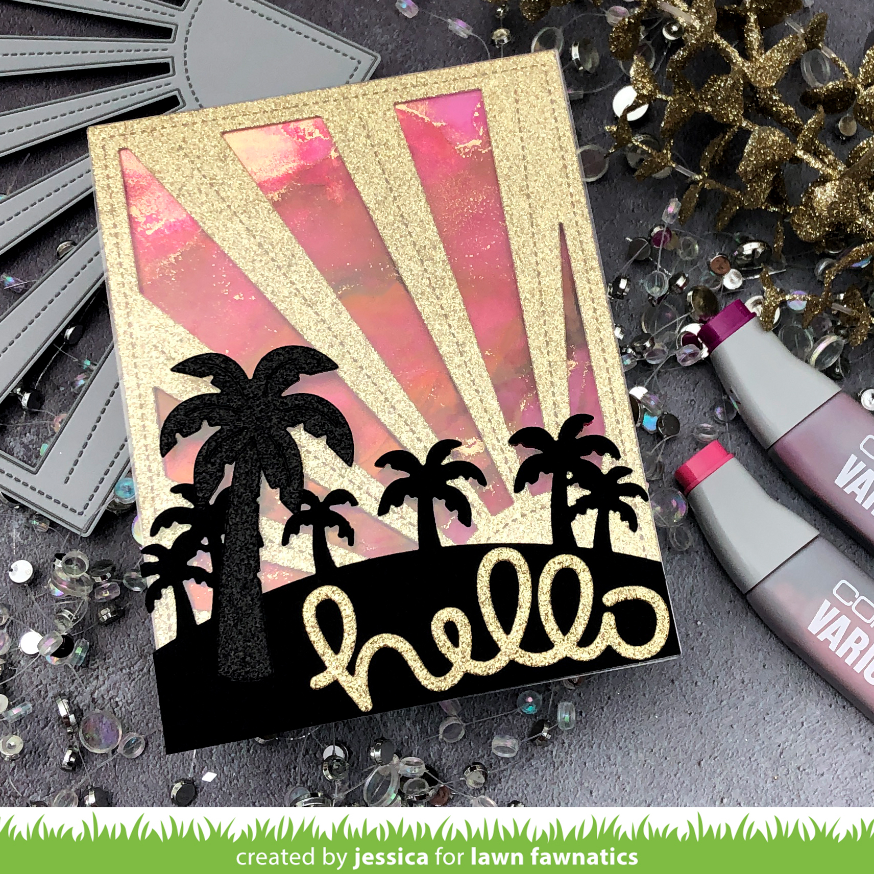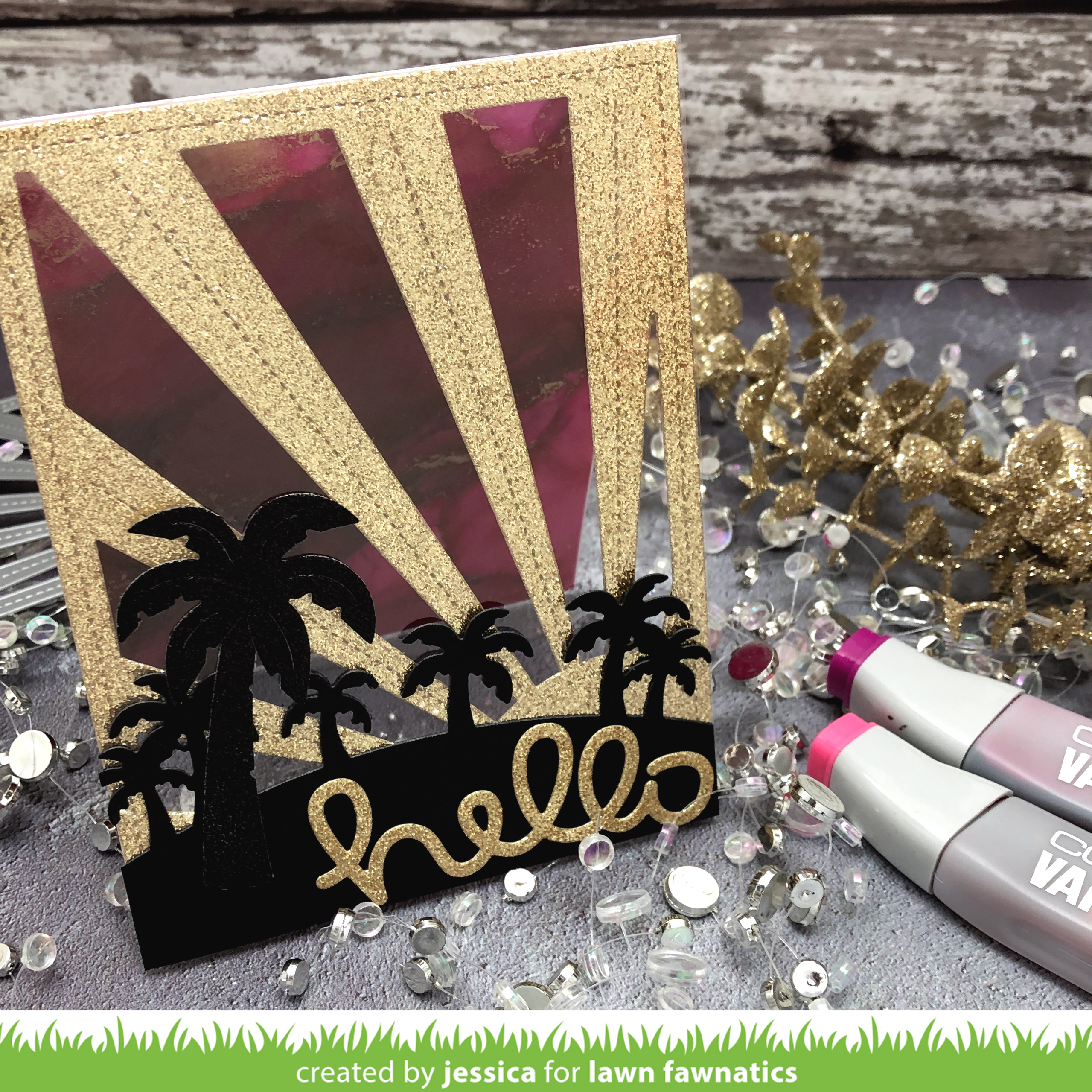 Next I die-cut the Sunray backdrop from gold glitter cardstock and adhered it to an acetate card base. Then I layered the Palm Tree backdrop and a few extra palm trees from the Tropical backdrop with black cardstock and black glitter cardstock and adhered them over the Sunray backdrop.