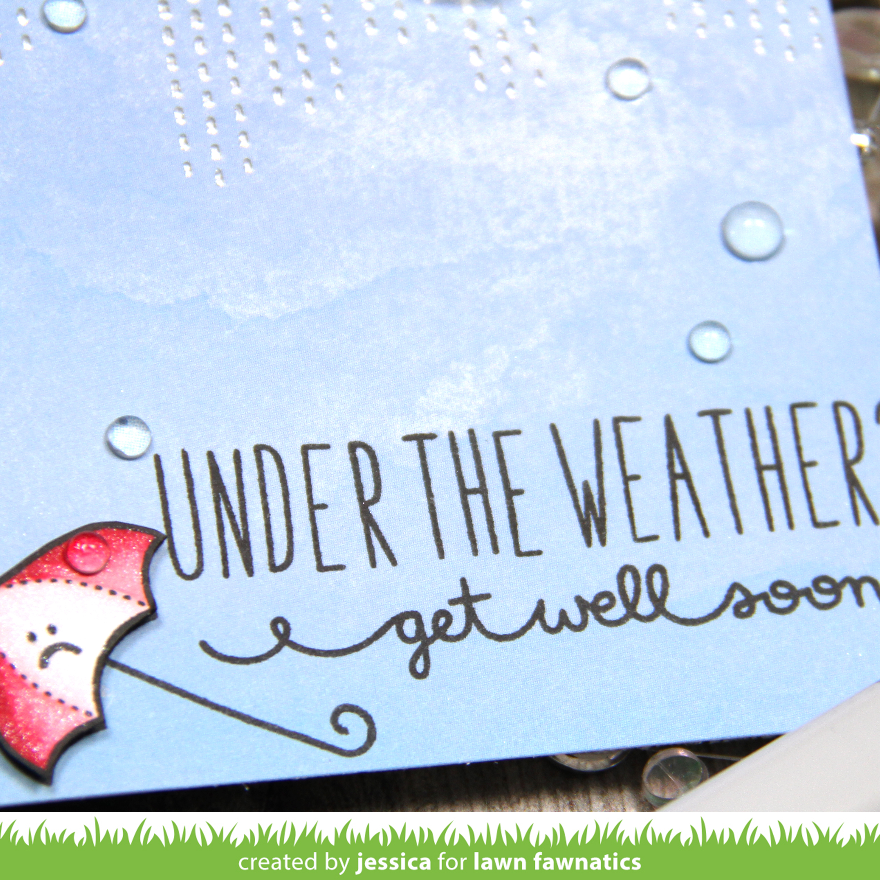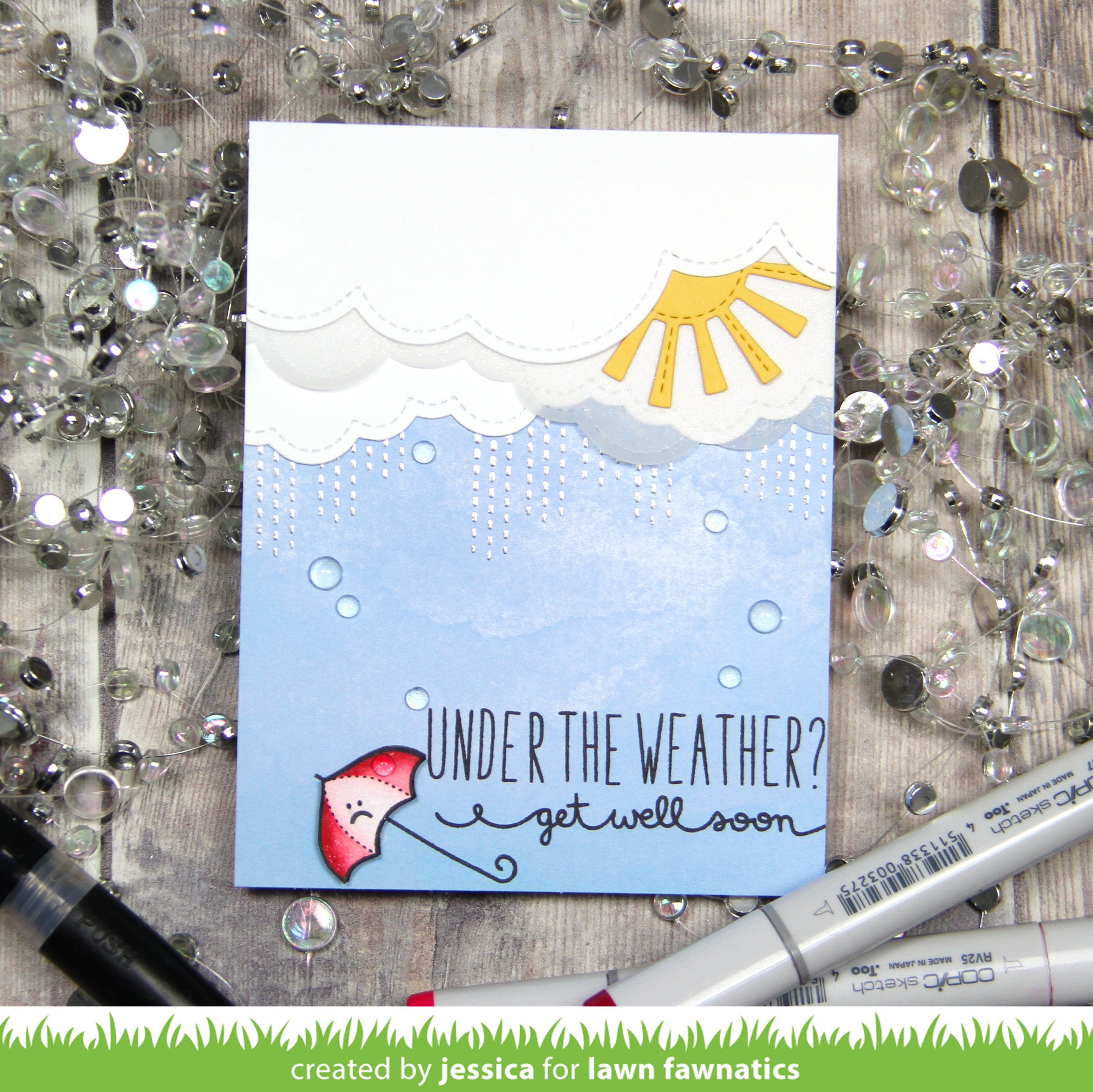 The Hello Baby set is one of my favorite for all the cute images and I thought the little umbrella would be perfect for a weather-themed get well card! I started by stamping the umbrella and coloring it with copics. I applied a coat of spectrum noir clear sparkle and then stamped the little sad face using a Lawn Fawn set where I wiped ink off the eyes and stamped it upside down to get the frown. I fussy cut the top of the umbrella and set it aside while I worked on the rest of the card.