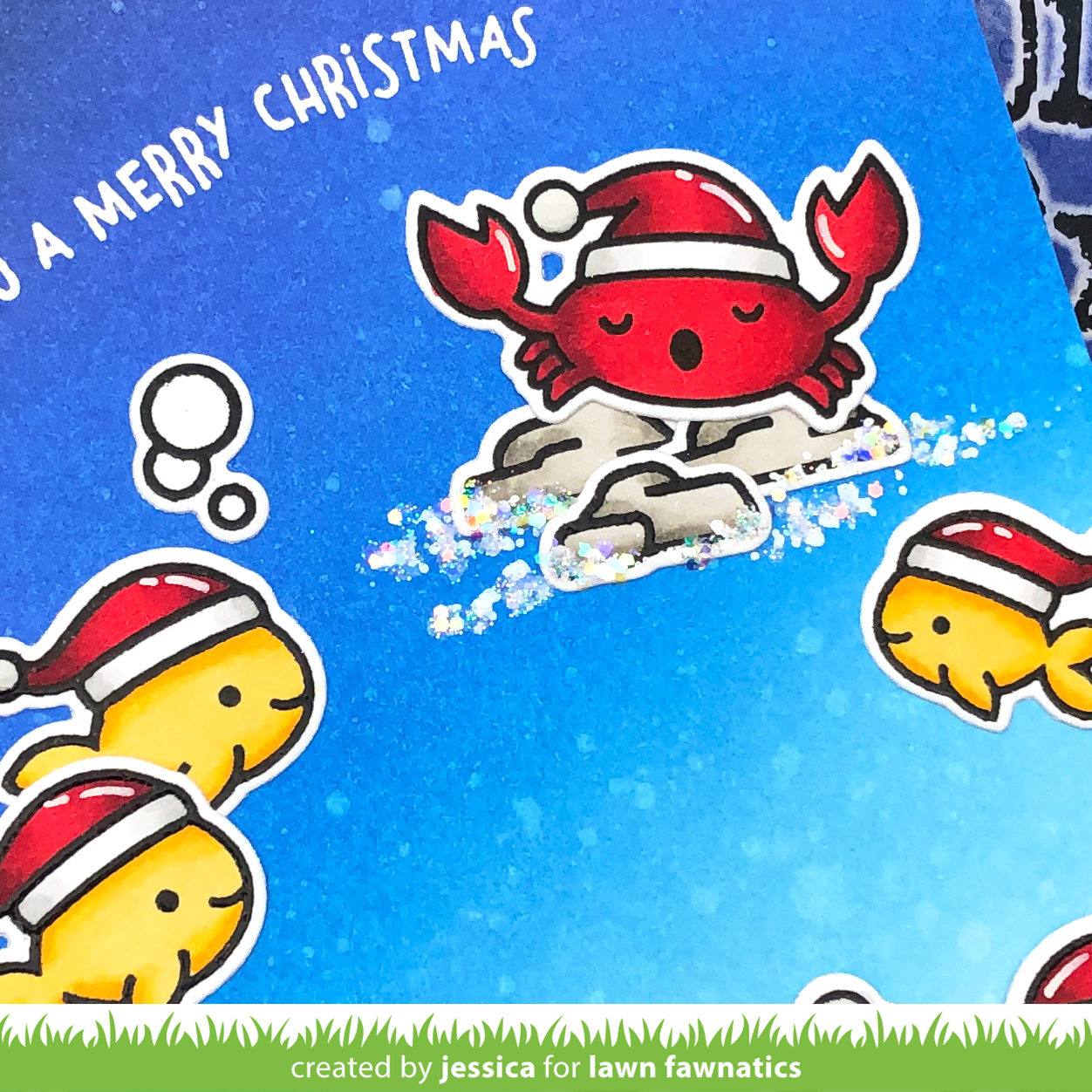 Next I stamped my sentiment onto the water and sand with versamark and heat-embossed it with white embossing powder. I added my critters and adhered them with a mix of regular adhesive and foam mounting tape. Finally I added dots with a white gel pen and a posca paint pen to create the look of bubbles and foam in the water. I added a little crystal clear glaze around those dots and sprinkled it with prisma and chunky glitter for a little extra sparkle! Now my penguin and fish choir is ready to start their holiday concert! 😉