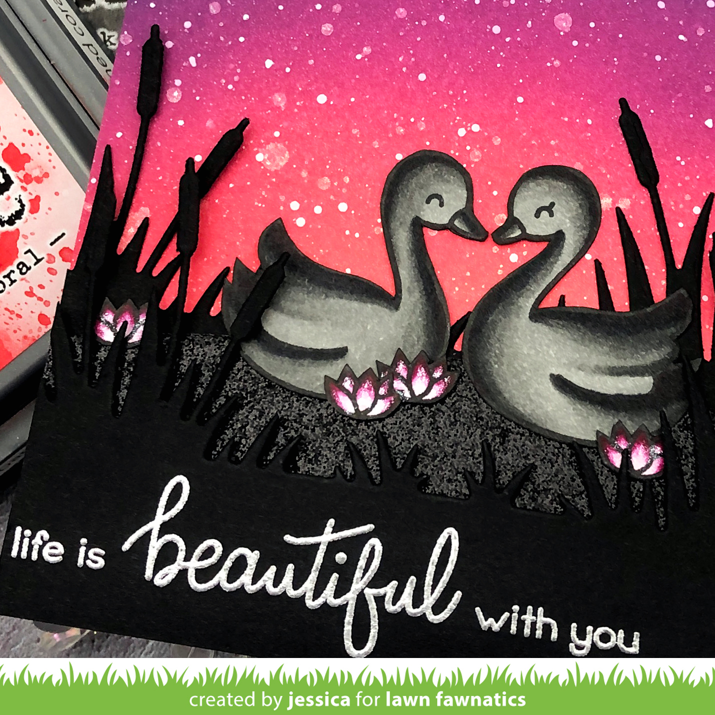 Next I die-cut the Cattails Border twice from black cardstock and the pond from Bayou Backdrop with black glitter cardstock. I also die-cut the Bayou Backdrop with black cardstock and trimmed off the stitched edge. I stamped the sentiment from Swan Soiree onto one of the borders and heat-embossed it with silver embossing powder. Then I stamped the swans and water lilies from Swan Soiree onto white cardstock and colored them with copic markers. Dark colors and shadings are not my strong suit so I reached out to my super talented friend Alberto for some tips on using darker colors and I’m so happy with how my swans turned out! They’re not perfect but I’m definitely inspired to continue pushing myself! And big BIG thanks to the fabulous Alberto for his guidance! If you don’t follow his blog or instagram you’re definitely missing out!!