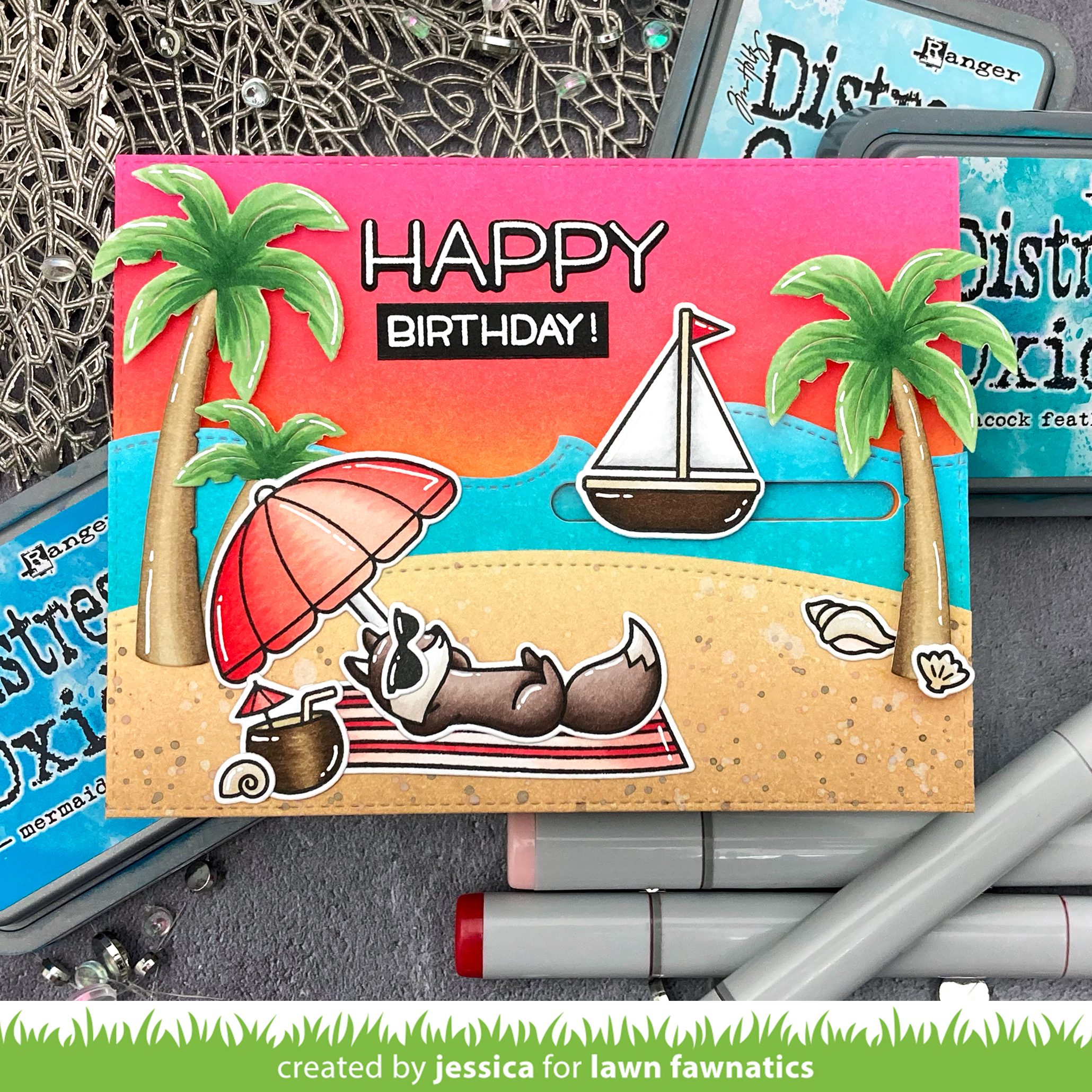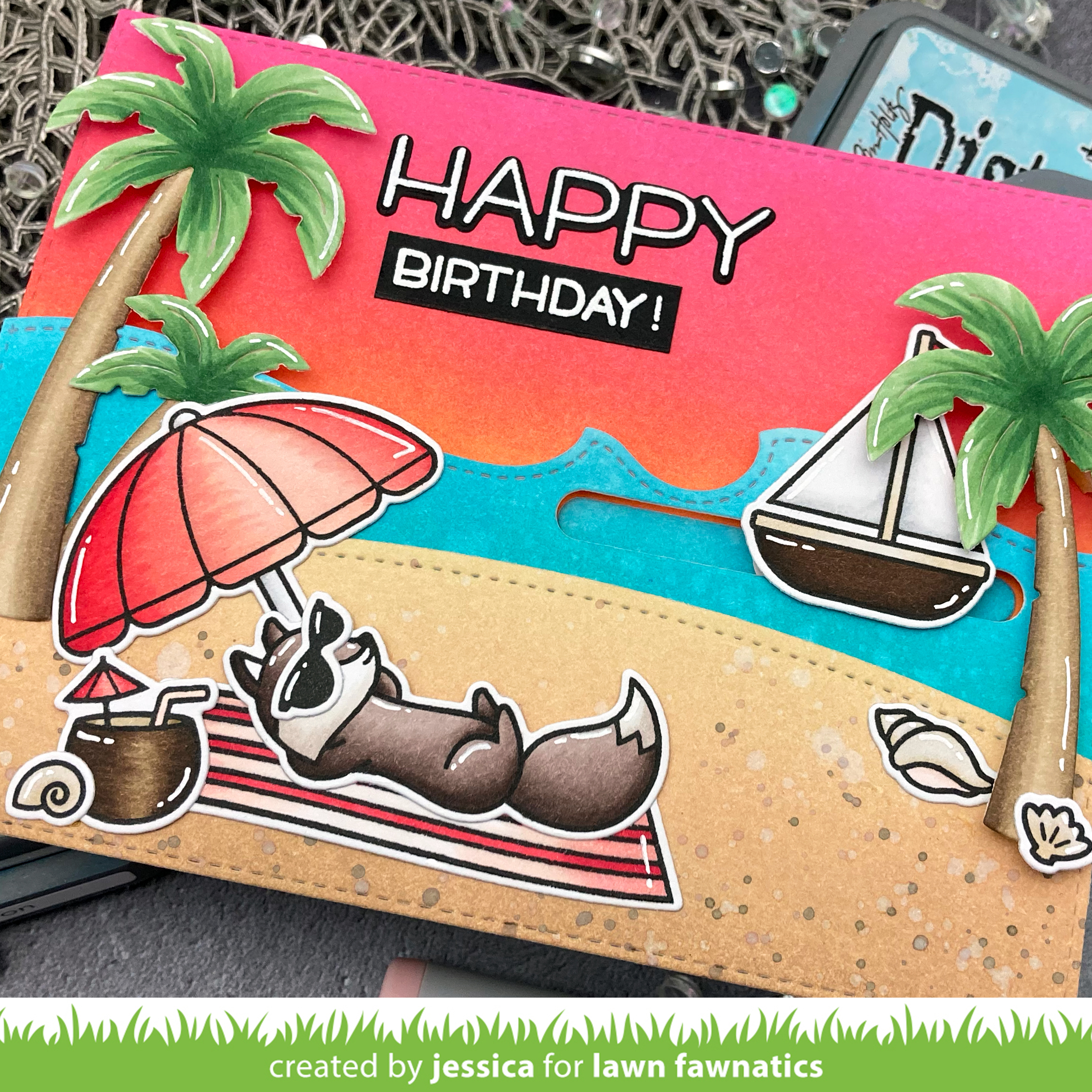 To put the card together I started by adhering the sky to an A2 panel. I die-cut a slider channel on the waves and then adhered it to the card with foam tape before using foam dots to add the sailboat to the channel. Then I built up the rest of my scene with a mix of foam tape and regular ATG adhesive. Especially when building scenes I like to use foam tape to add a little extra dimension…for example, I love how the palm trees kinda pop off this card! To finish the scene I added a few accents with a white gel pen and nuvo crystal glaze.