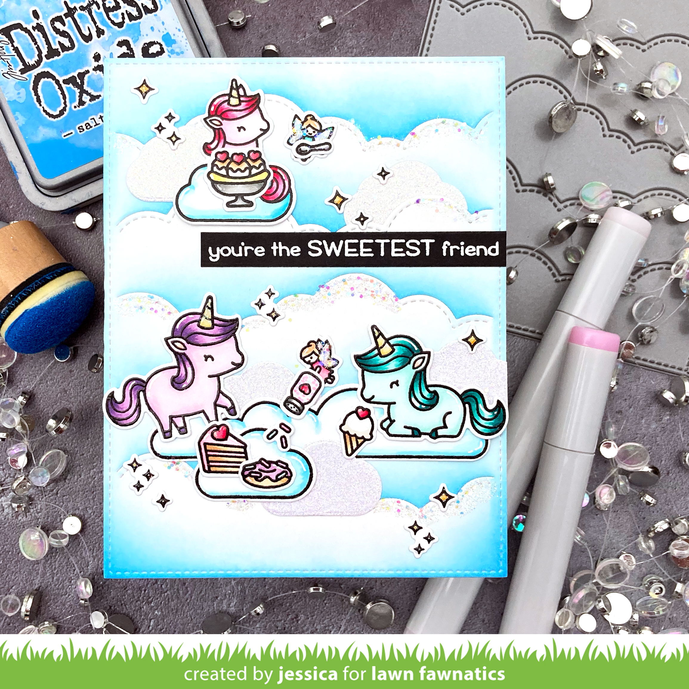 Next I die-cut the Puffy Cloud Backdrop from white cardstock and blended a little salty ocean distress oxide across the bottom of each cloud. Then I arranged my scene across the panel and started adhering everything with a mix of regular adhesive and foam mounting tape. Then I added a little glossy accents to the clouds and fairy wings and sprinkled them with chunky and prisma glitter. I also added accents with the glitter pen and a white gel pen to finish the card with lots of sparkle!