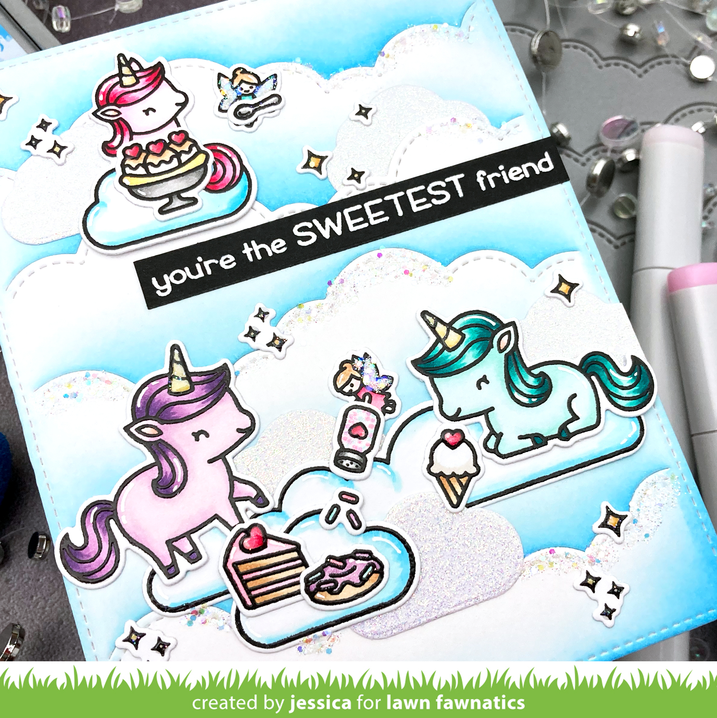 I just love the new Unicorn Picnic set and thought it would be perfect for this challenge! I started by stamping all the images (and extra sparkles) with versafine and heat-embossed them with clear embossing powder. I colored them with copic markers in light pastel shades and then die-cut them with the coordinating dies. Then I stamped the sentiment onto black cardstock with versamark and heat-embossed it with white embossing powder before trimming it down to a thin label.