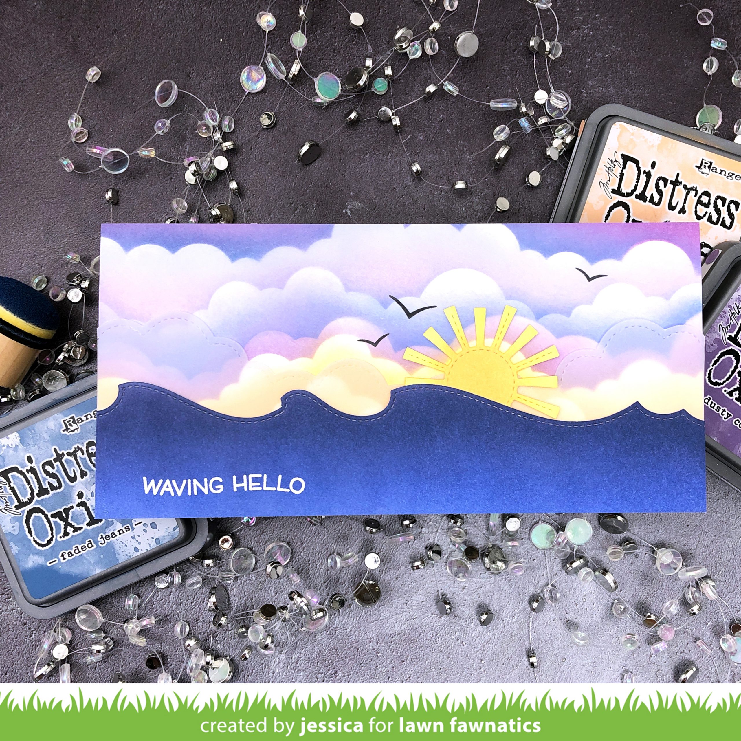 Once the blue panel was totally dry I die-cut it with the Stitched Wave borders. The die isn’t sized for a slimline card so I can it halfway through my die-cutting machine and then rearranged the die and continued die-cutting so it would fit the long panel. I also stamped the sentiment from Wavy Sayings and heat-embossed it with white embossing powder. Then I die-cut the Puffy Cloud borders from vellum and the sun from white cardstock. I blended Squeezed Lemonade and Dried Lemonade distress oxide ink onto the sun and then arranged it with the clouds around the waves. To finish the card I added a few seabirds from Smooth Sailing stamped in jet black ink!
