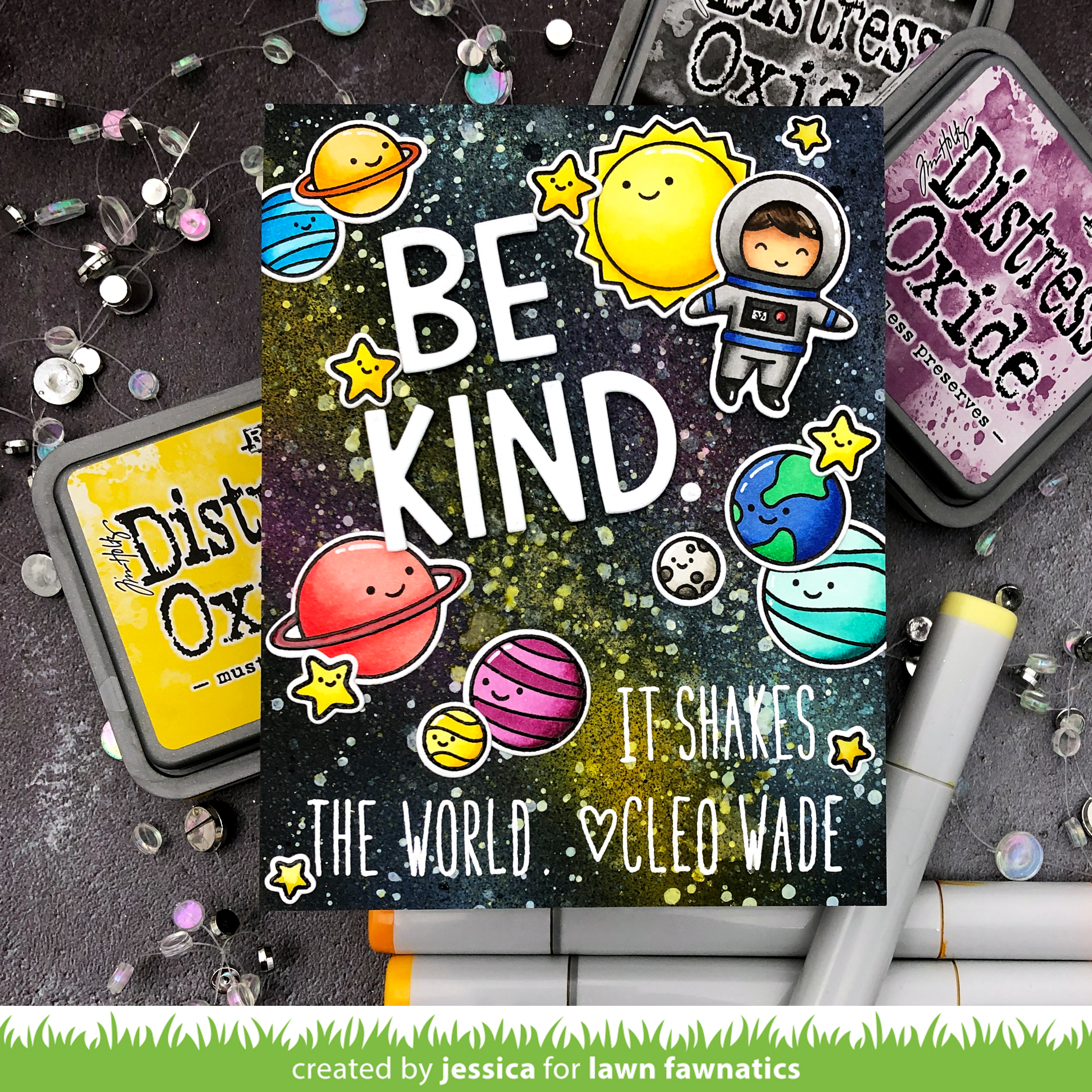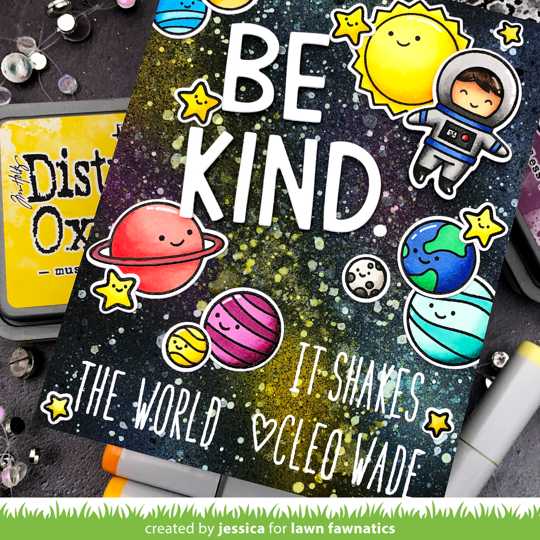 Be Kind. It shakes the world. That really does say it all, doesn’t it? 🙂 So to start I created a galaxy background. I blended Mustard Seed, Seedless Preserves, and Cracked Pistachio distress oxide ink onto a panel of strathmore bristol smooth cardstock in random splotches. Then I covered most of the colors using Chipped Sapphire and Black Soot distress oxide ink. I let the panel dry and then spritzed it with water and blotted off the excess. Once that dried I splattered the panel with white gouache and shimmer spray. Finally I added a few spritzes of distress oxide sprays in Black Soot, Mustard Seed, and Cracked Pistachio to give it even more dimension and texture! Then I set the panel aside to dry completely while I worked on the rest of the card.