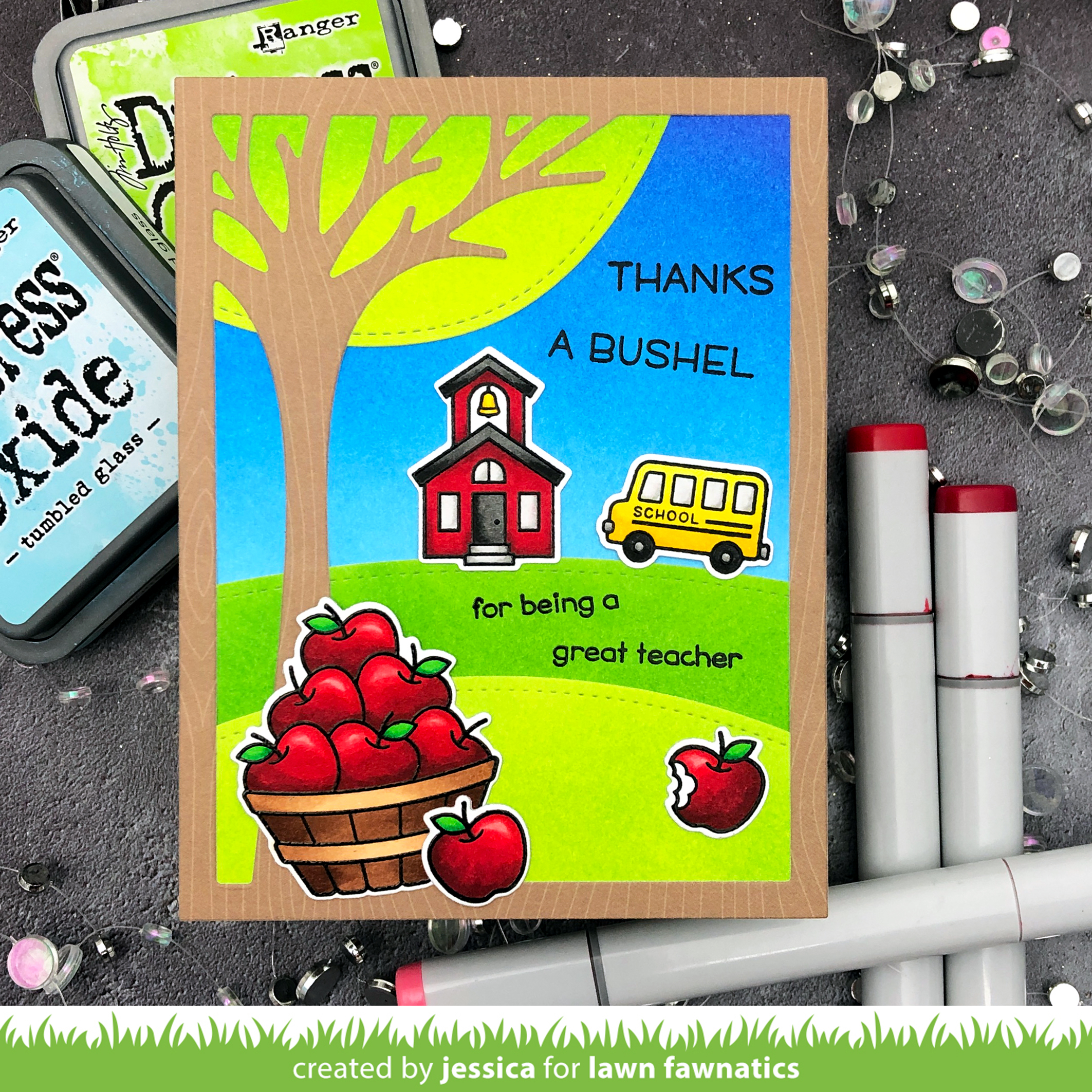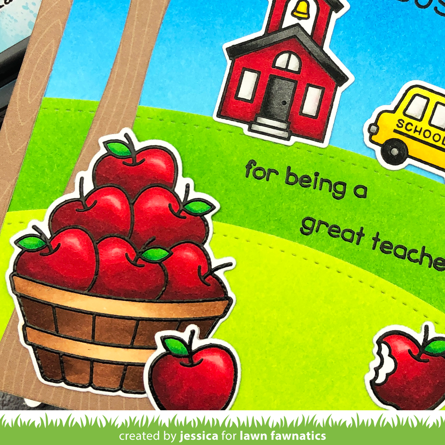 One of my all-time favorite Lawn Fawn sets is Thanks a Bushel so I wanted to make it the star of my card! It’s just a fun set to color and perfect for fall and teachers! I stamped the images from that set as well as the schoolhouse and bus from Village Heroes and colored them with copic markers before die-cutting them with the coordinating dies.