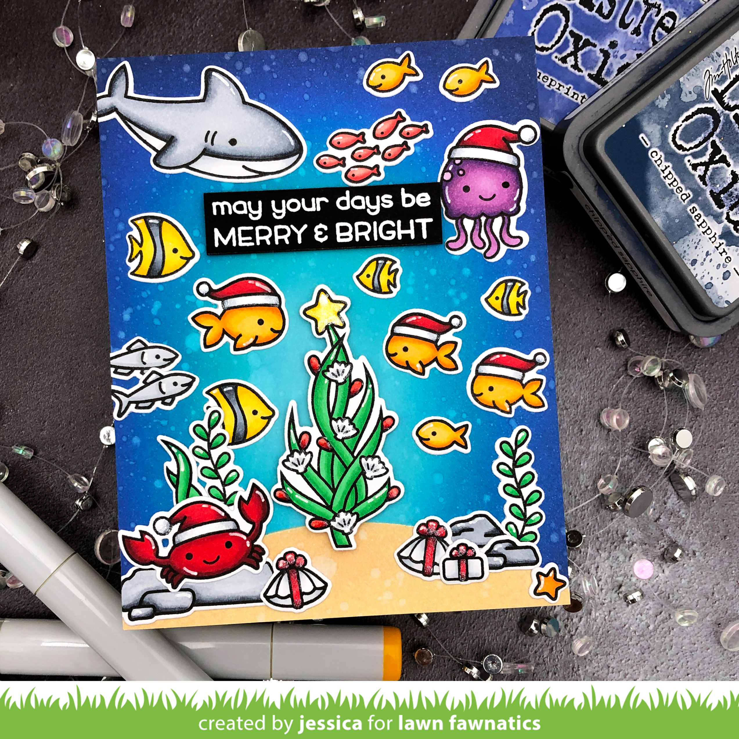 Christmas Fishes is one of my all-time favorite sets and I thought it would be perfect as the main focus for my card! I also added a bunch of fishy friends and accessories from Mermaid For You, Fintastic Friends, and Duh-Nuh! I stamped all of them onto white cardstock with copic-friendly black ink and then colored them with copics before die-cutting them with the coordinating dies. I added a few accents with a white gel pen and then set them aside while I worked on the rest of the card.
