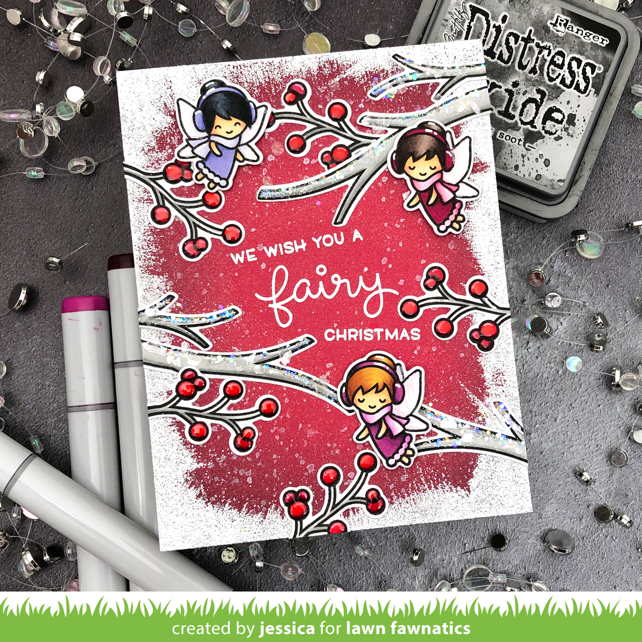 Next I stamped the berries and fairies from Frosty Fairy Friends and the branches from A Bug Deal and colored them with copic markers. I die-cut them with the coordinating dies and then arranged them around the panel. I adhered the branches and berries with regular adhesive and used foam mounting tape for the fairies. Then I added accents with a white gel pen and a little spectrum noir clear sparkle to their wings. To finish the card I added crystal glaze to the tops of the branches and sprinkled them with crushed mica flakes, chunky, and prisma glitter. Once it was mostly dry I also added a layer of crystal glaze to the berries for a little extra shine!