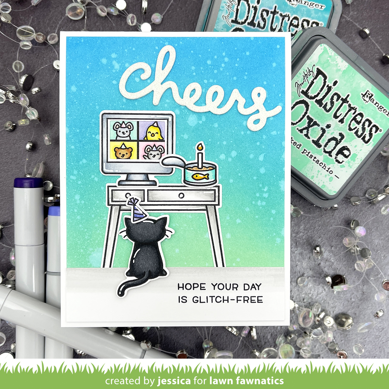 I started by stamping images from the new Virtual Friends and older images from Meow You Doin’ and Just Keep Swimming with copic friendly black ink. I colored them with copics and die-cut them with the coordinating dies. I trimmed a piece to use for the ground, added a little shading with copics, and stamped a sentiment from Virtual Friends. I also die-cut the Scripty Cheers from white glitter cardstock.