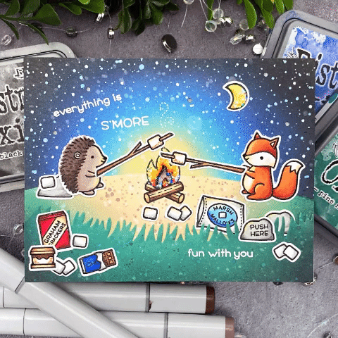 To start I stamped all the images with versafine and heat-embossed them with clear embossing powder. I colored all the images with copic markers and die-cut them with the coordinating dies. Then I stamped the campfire onto a panel of strathmore bristol cardstock and colored it with copic markers. After I finished coloring I masked the campfire and ground. Then I blended the sky with scattered straw, broken china, blueprint sketch, chipped sapphire, and black soot distress oxide ink. Next I used antique linen, tea dye, evergreen bough, pine needles, and black soot distress oxide to blend the ground and grass. I splattered the panels with water and concentrated distress oxide ink and let it dry.
