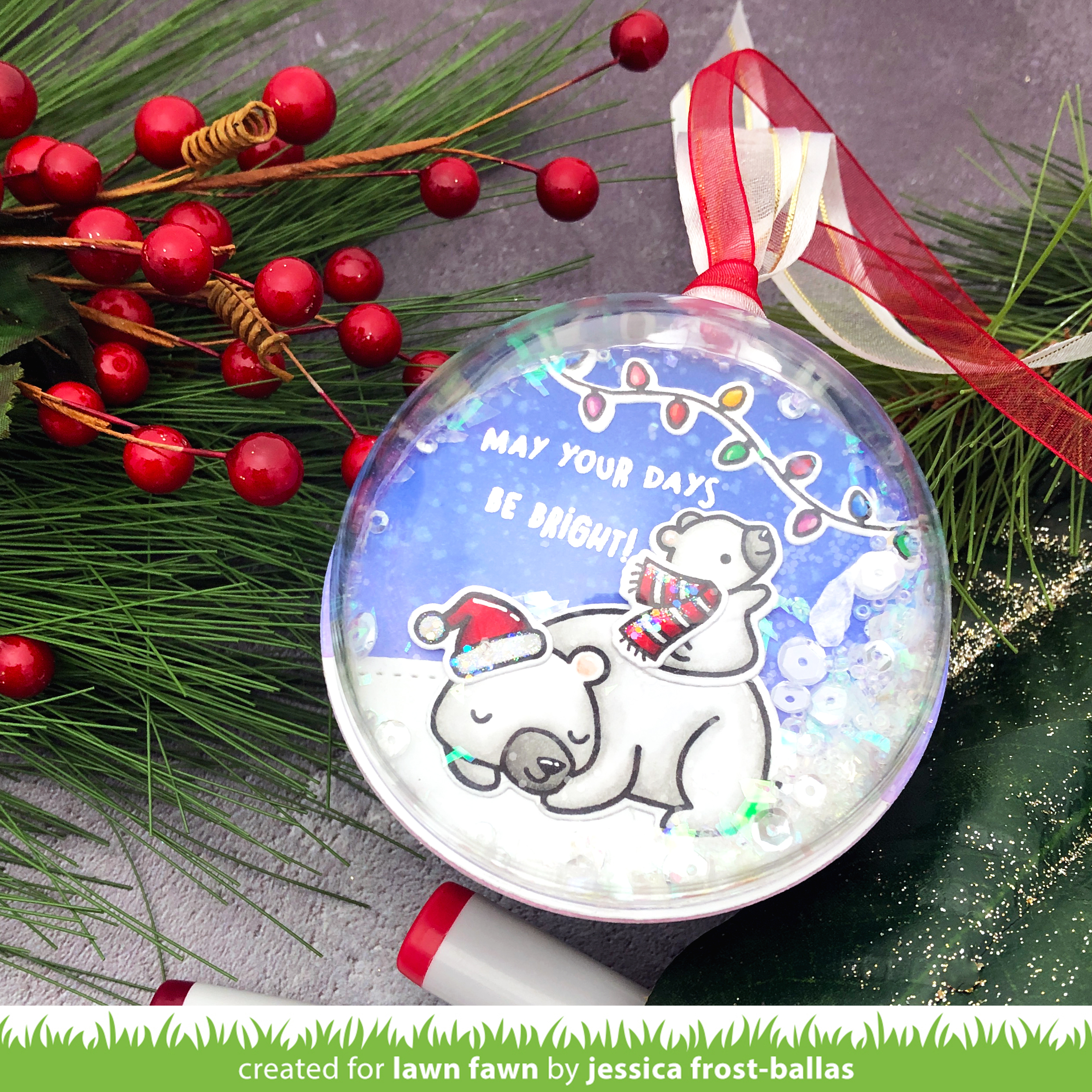 Meanwhile I I kept the back of the ornament simple and added a few more copic-colored images on a circle cut from the Let It Shine patterned paper pack. I also stamped and die-cut a little tag to add. Once all the crystal glaze was dry I die-cut a few more circles from white cardstock and adhered them all together to create a thick chipboard-like panel. Then I carefully piled sequins, mica chips, glitter, and beads on top of the bears and then added a line of hot glue around the edge of the circle. I pressed the plastic ornament into the glue until it set. Being careful not to shift the shaker contents around I balanced a few acrylic blocks on the top of the ornament and let it dry overnight. Once it was totally dry I gave it a good shake and then finished it with a few sparkly ribbons!