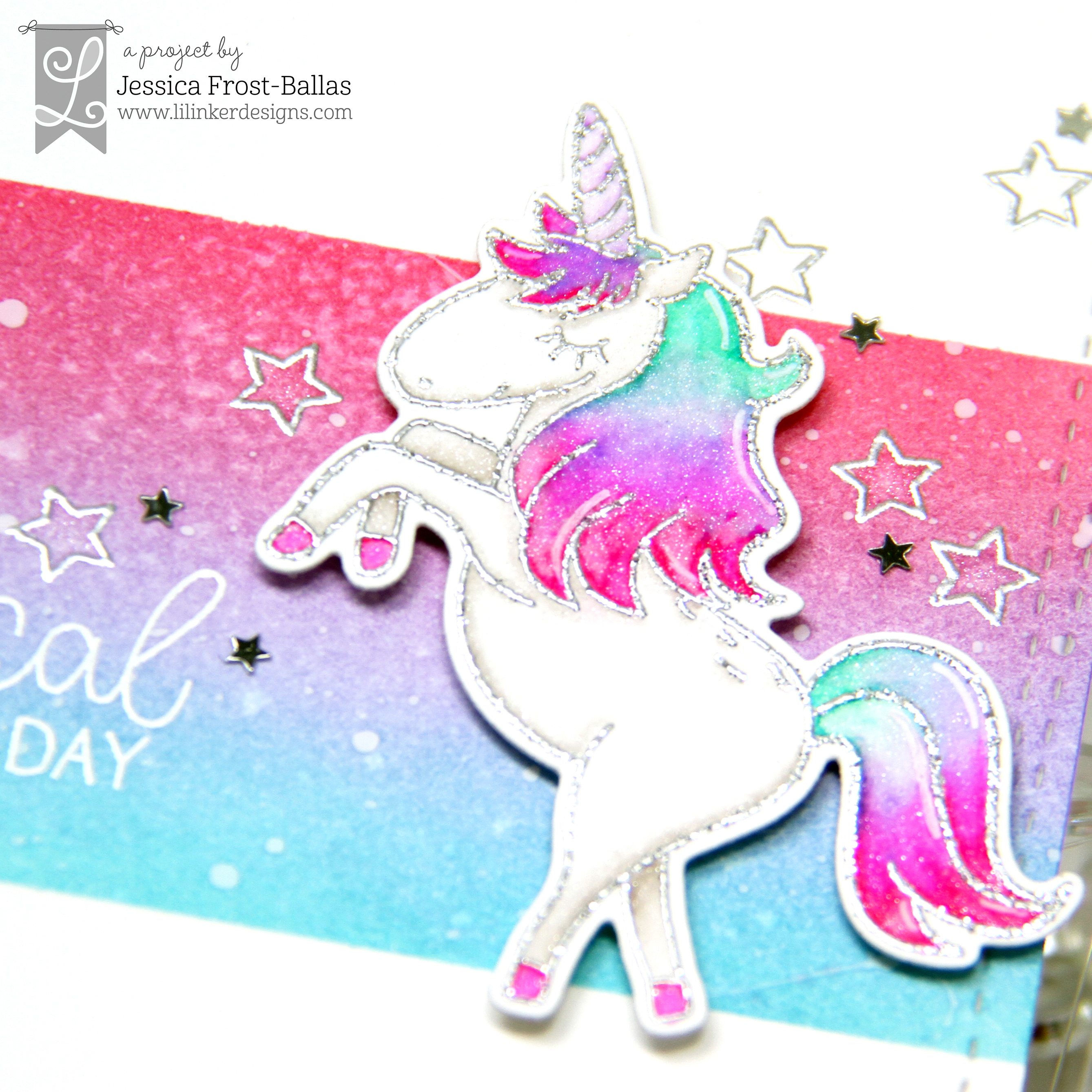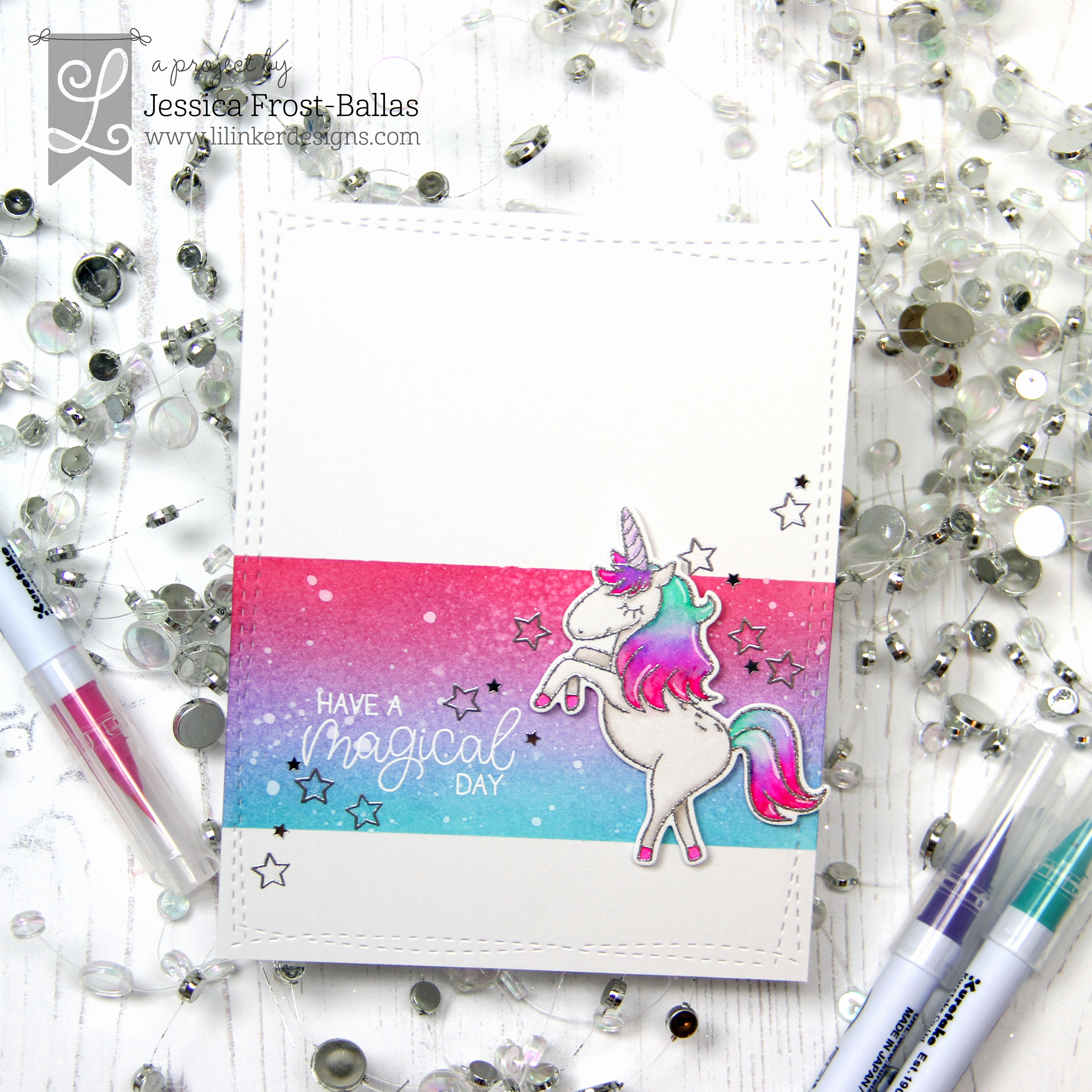 Isn’t that unicorn adorable?! I started by stamping her with versamark and heat-embossing her with silver sparkle embossing powder. Then I colored her using zig markers in Pink, English Lavender, Turquoise Green and a little shading with Gray Tint. I die-cut her with the coordinating dies and then added a few white gel pen accents and a little sparkle with a spectrum noir clear sparkle pen. I ran a piece of Bristol Smooth cardstock through my bigshot with the Silly Stitched dies and then I masked off a section of the cardstock and blended distress inks in Picked Raspberry, Shaded Lilac, and Peacock Feathers onto it. Next I splattered it with white acrylic paint and water droplets. I also added a few sprays of shimmer spray for a little extra sparkle. Once it dried completely I stamped the sentiment from Magical Winter with versamark and heat-embossed it with white embossing powder. I also stamped the stars and heat-embossed those with silver embossing powder. I adhered my gorgeous little unicorn and added a few mini silver stars to finish the card!