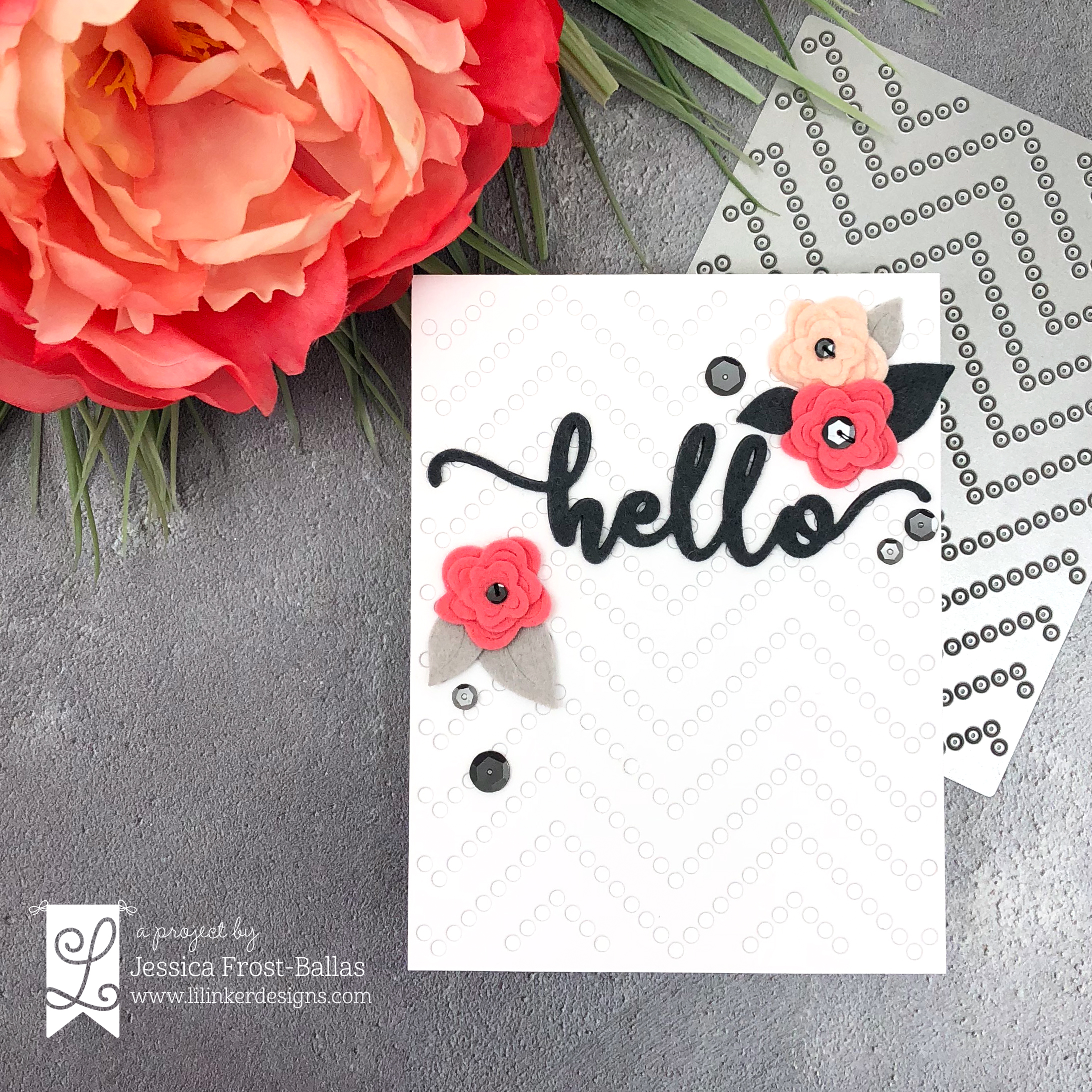 I die-cut the Hello word die from grey felt and black cardstock and adhered them together. Then I die-cut the Dotted Chevrons cover up die using white cardstock and layered it on a white card base. I adhered the felt flowers and sentiment using a hot glue gun and then added a few dark grey sequins for a little extra shine!