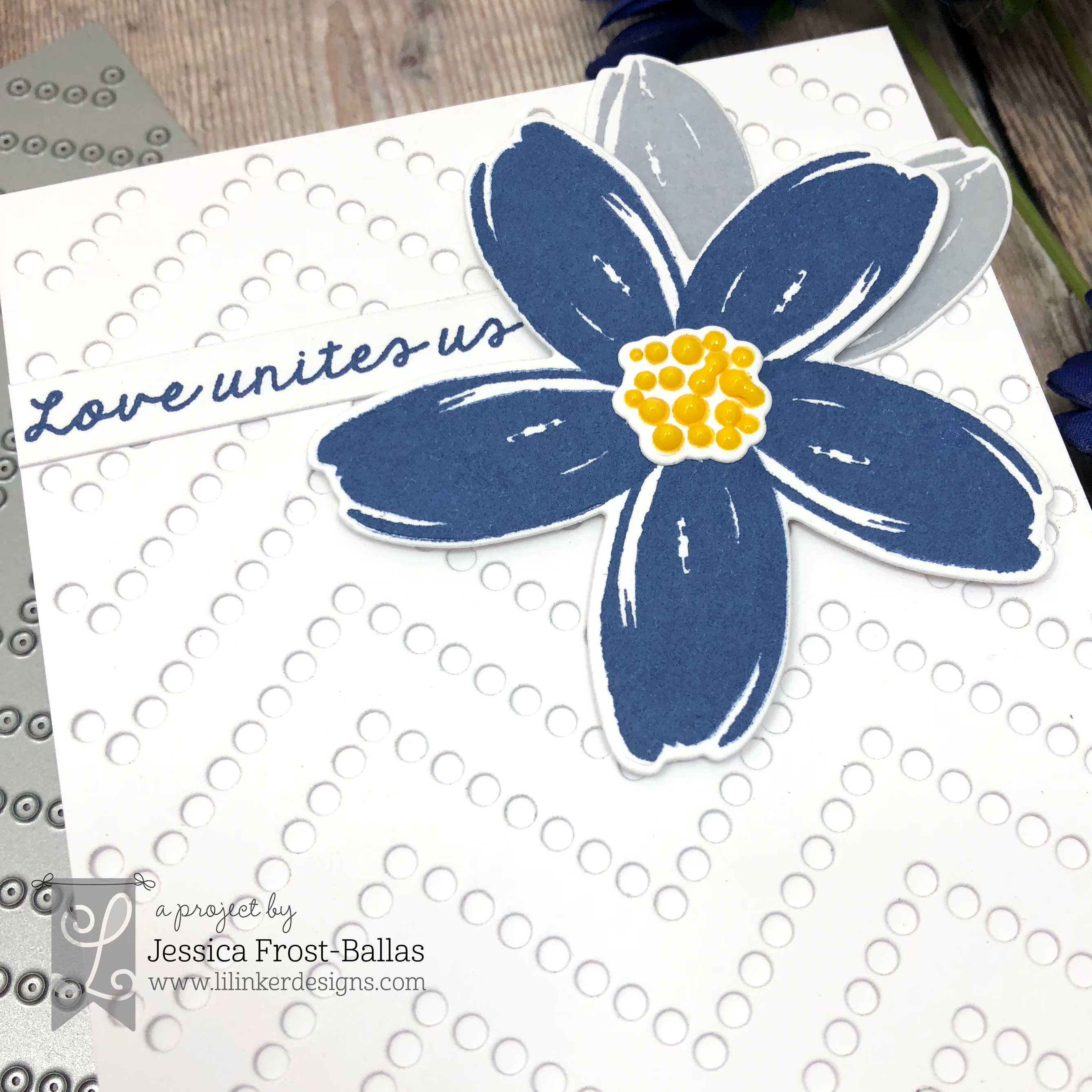 I die-cut the Dotted Chevron cover up die with white cardstock and layered that on a white card base. Then I stamped the sentiment from One Love and trimmed it down to a skinny label. I adhered that to the top of the panel and then added my flower on top! This would be a pretty design for a wedding card and you could easily customize that flower with any combination of colors!