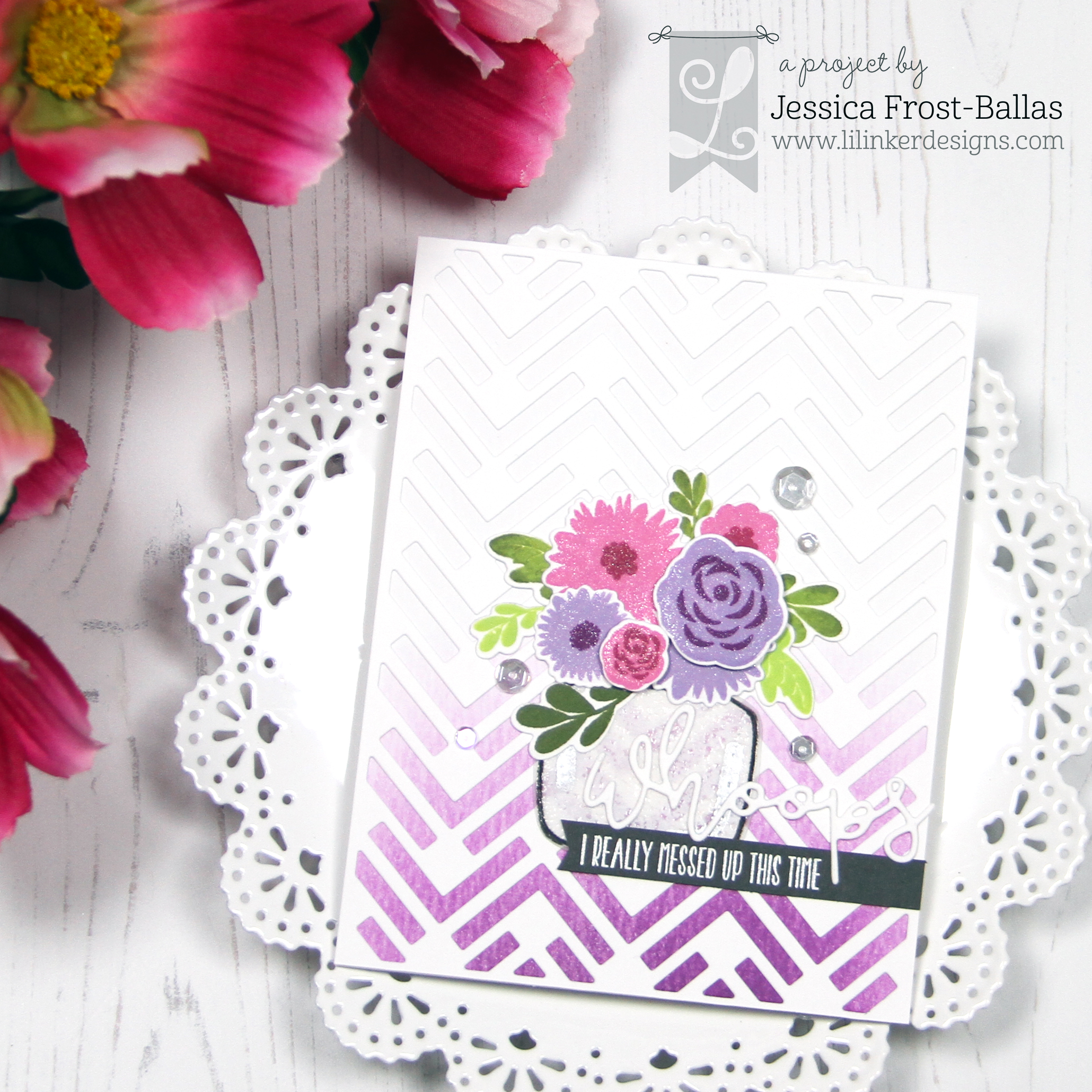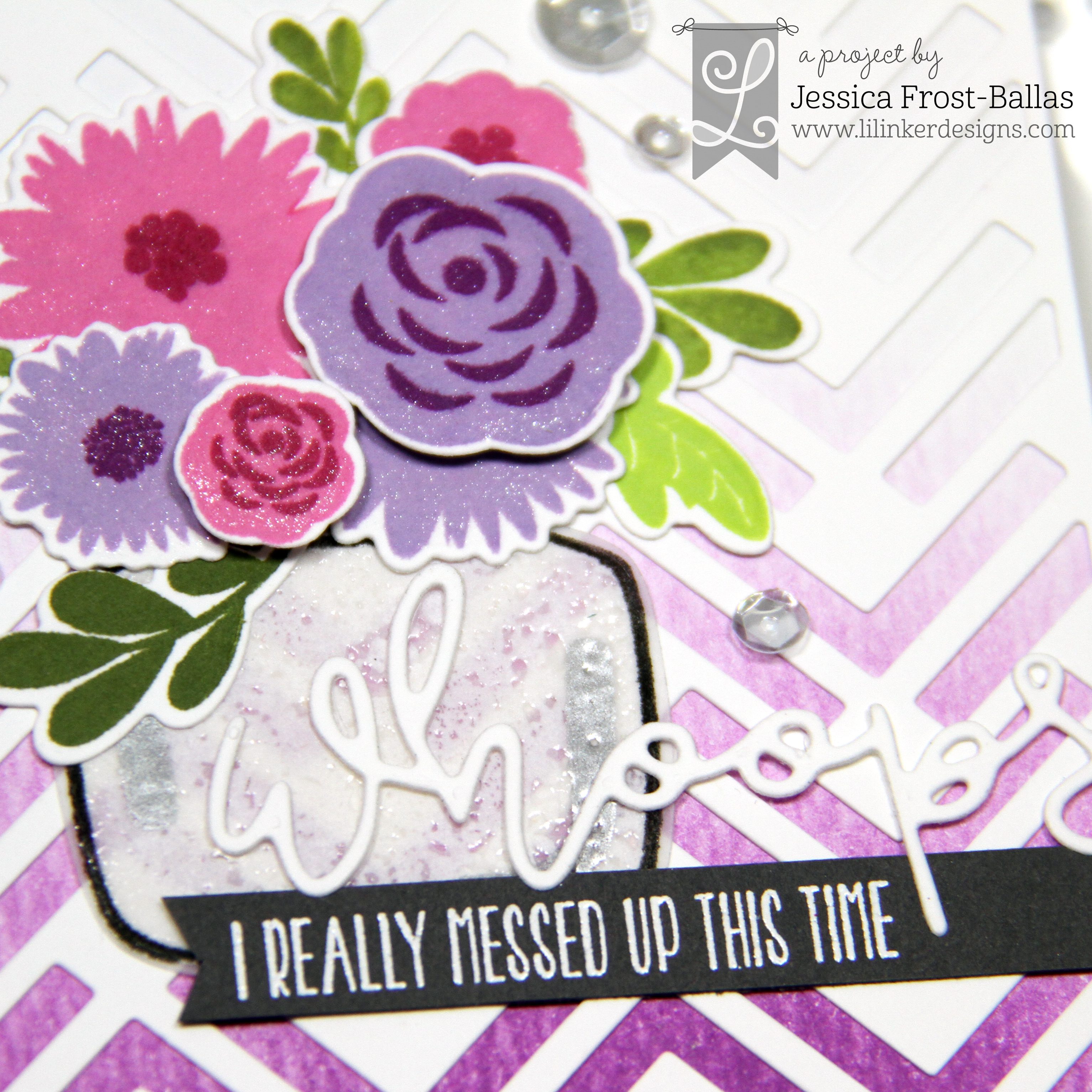 I used my MISTI to mass stamp lots of flowers and foliage from Jar of Flowers and then arranged them in my little frosted glass jar! I used sentiments from the Whoops set and the Diamond Chevron plate to create the background for my floral arrangement.