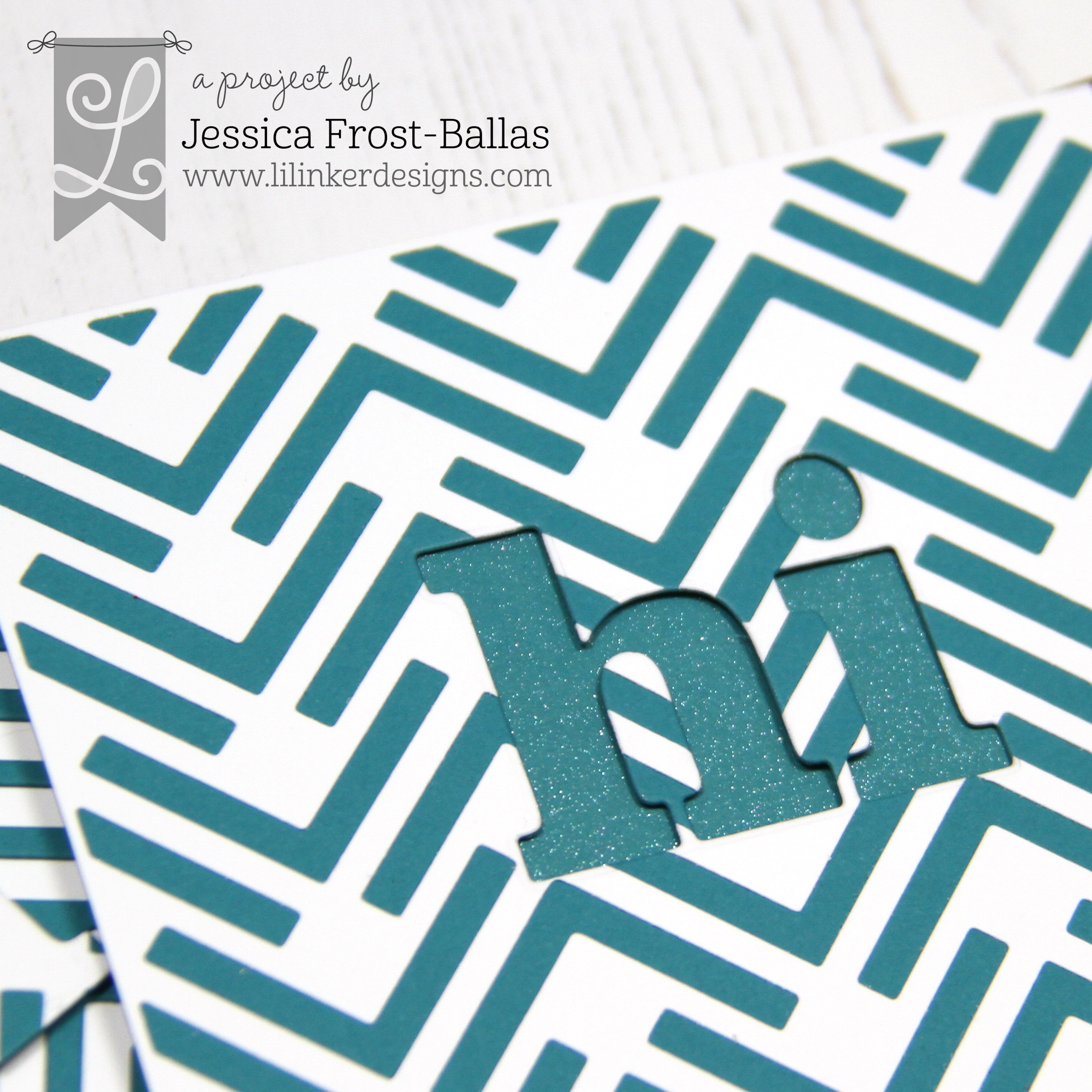 I started by die-cutting the Diamond Chevron cover up plate with teal and white cardstock. Then I adhered the cover up plate to the opposite teal or white cardstock using glossy accents. I made sure to add a little extra glossy accents to the top third of my card where I intended to die-cut my sentiment. Then I ran the Hi word die through both cards and reserved the pieces. For one card I simply added a backing of teal cardstock that I coated with a thick layer of spectrum noir clear sparkle. For the second card I used foam mounting tape to adhere the opposite negative to the card panel resulting in somewhat of a eye-crossing look! 😉