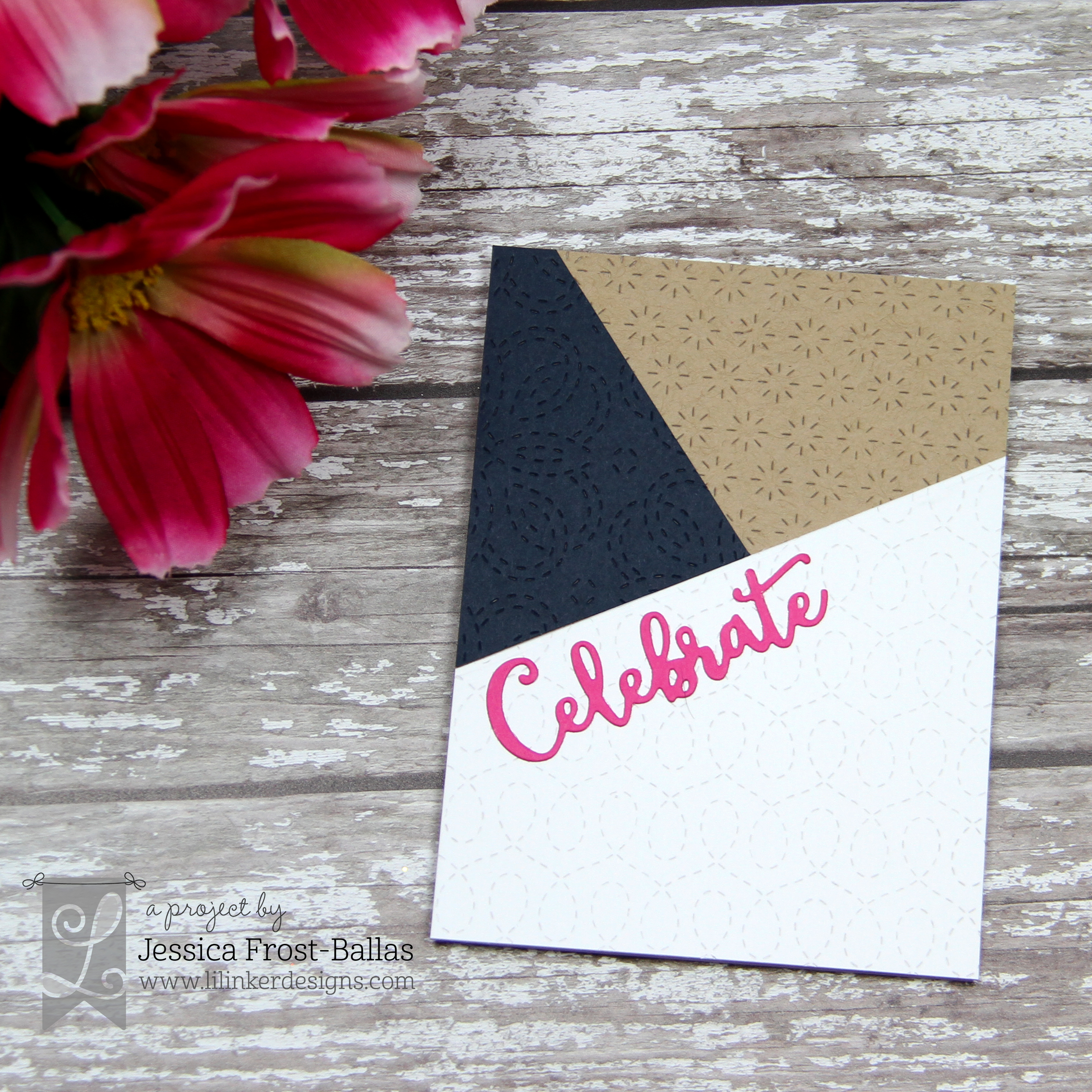 I love the coverplate dies that Lil’ Inker Designs carries and I wanted to put the focus on them. I used the Quilted Stitched So Sunny die, the Quilted Stitched So Knotty die, and the Quilted Swirl Stitched die and die cut them from white, kraft, and navy cardstock. Then I used the Color Blocking die to die-cut the panels on an angle. I mix and matched the patterned pieces to create three different card fronts. I adhered them to a white card base and then added the Celebrate word die cut from hot pink cardstock. Simple but striking! 🙂