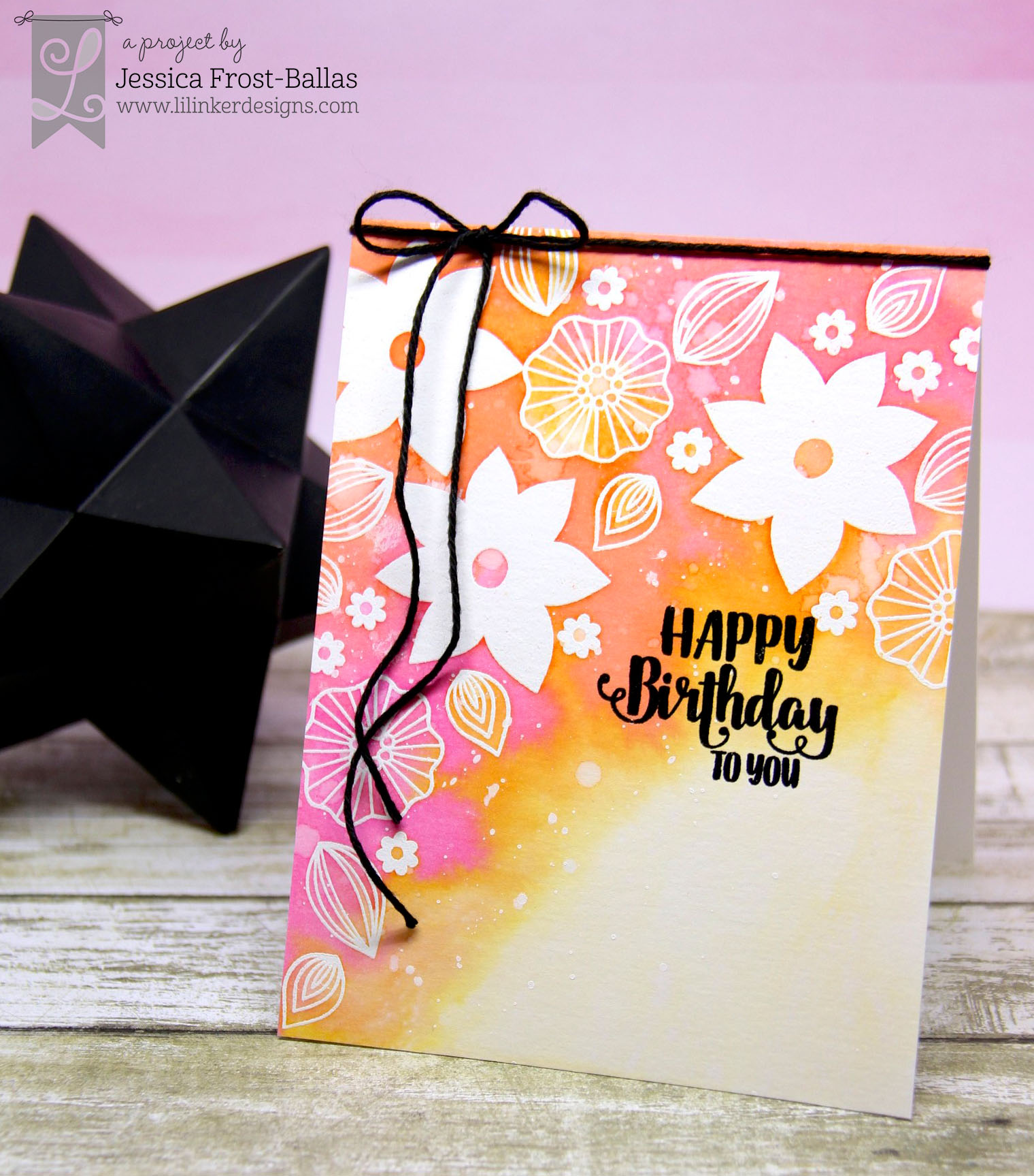 You know I love my distress inks, right! 😉 So I stamped the florals with versamark and heat-embossed them with white embossing powder. Then I smooshed Picked Raspberry, Abandoned Coral, and Dried Marigold distress ink onto an acrylic block and painted it onto the background with a large round paintbrush. Once it dried I stamped the sentiment with versafine and heat-embossed it with clear embossing powder. To finish the card I added a little twine and adhered it to a card base!