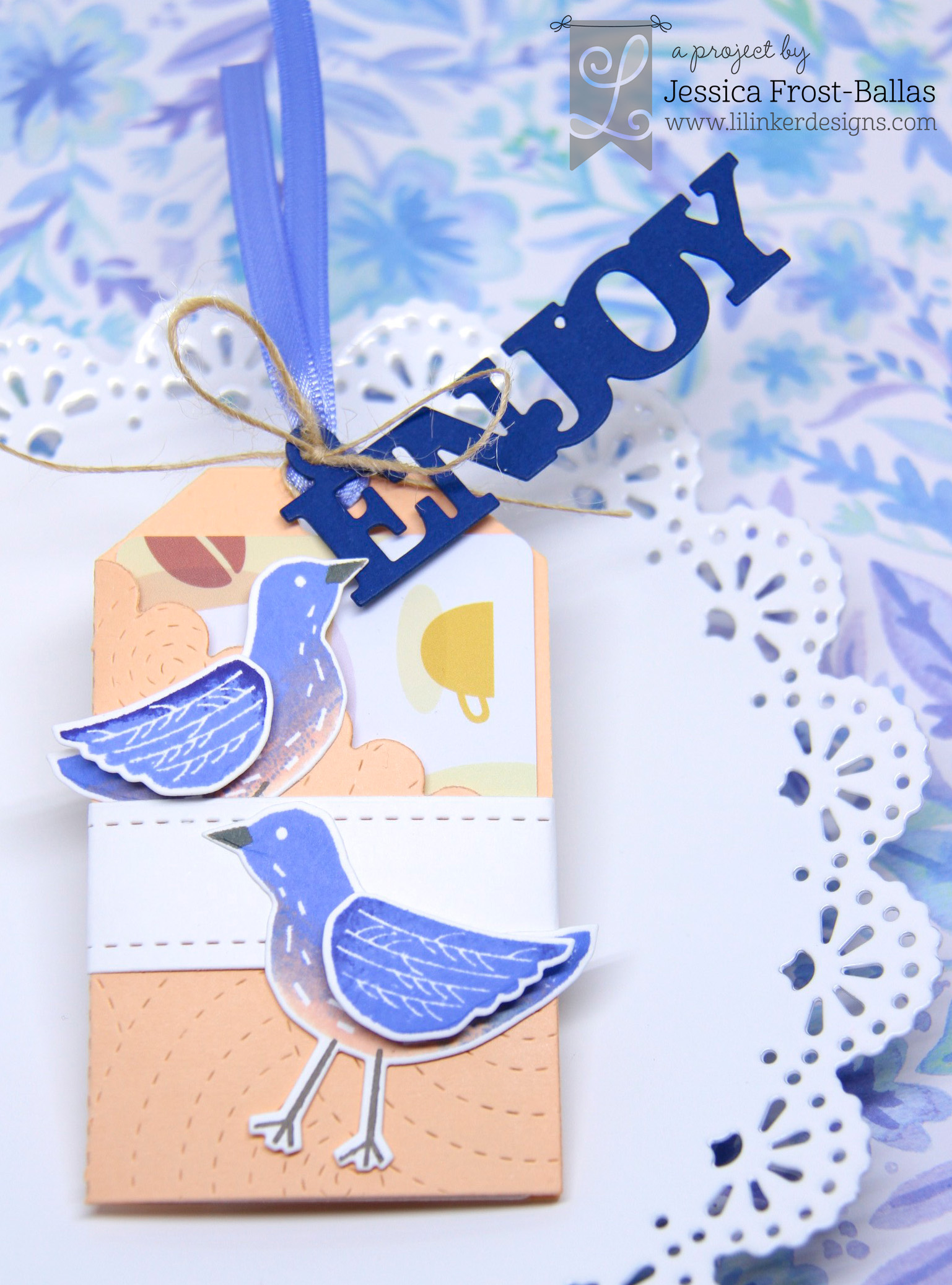 Aren’t these birds cute?! I love all the different ways the design team ladies have used these birds…I’ve seen robins, goldfinches, sparrows, but I was inspired by Sarah Jay’s bluebird! I have a beautiful pair of bluebirds who live in my backyard and I thought they were perfect inspiration for my gift card holder! I placed the birds in my MISTI and stamped them several times inking up different areas of the stamp with different colored inks. Once I was done stamping I die-cut them using the coordinating dies. I added the birds’ wings with foam mounting tape for a little dimension and then set them aside to work on the rest of the tag. I ran a piece of light peach cardstock through my Big Shot with the Quilted Stitched Spirals cover up die and then ran it through a second time with the Scalloped Folding Tag Die. I placed my Starbucks gift card inside the tag and then wrapped a piece of white cardstock around the tag to keep it closed. I used the Stitched Rectangle Mats to cut the stitched border to give it a more finished edge. Finally I added the sentiment tag from Everyday Word Tag dies and a little twine and ribbon to finish the tag!