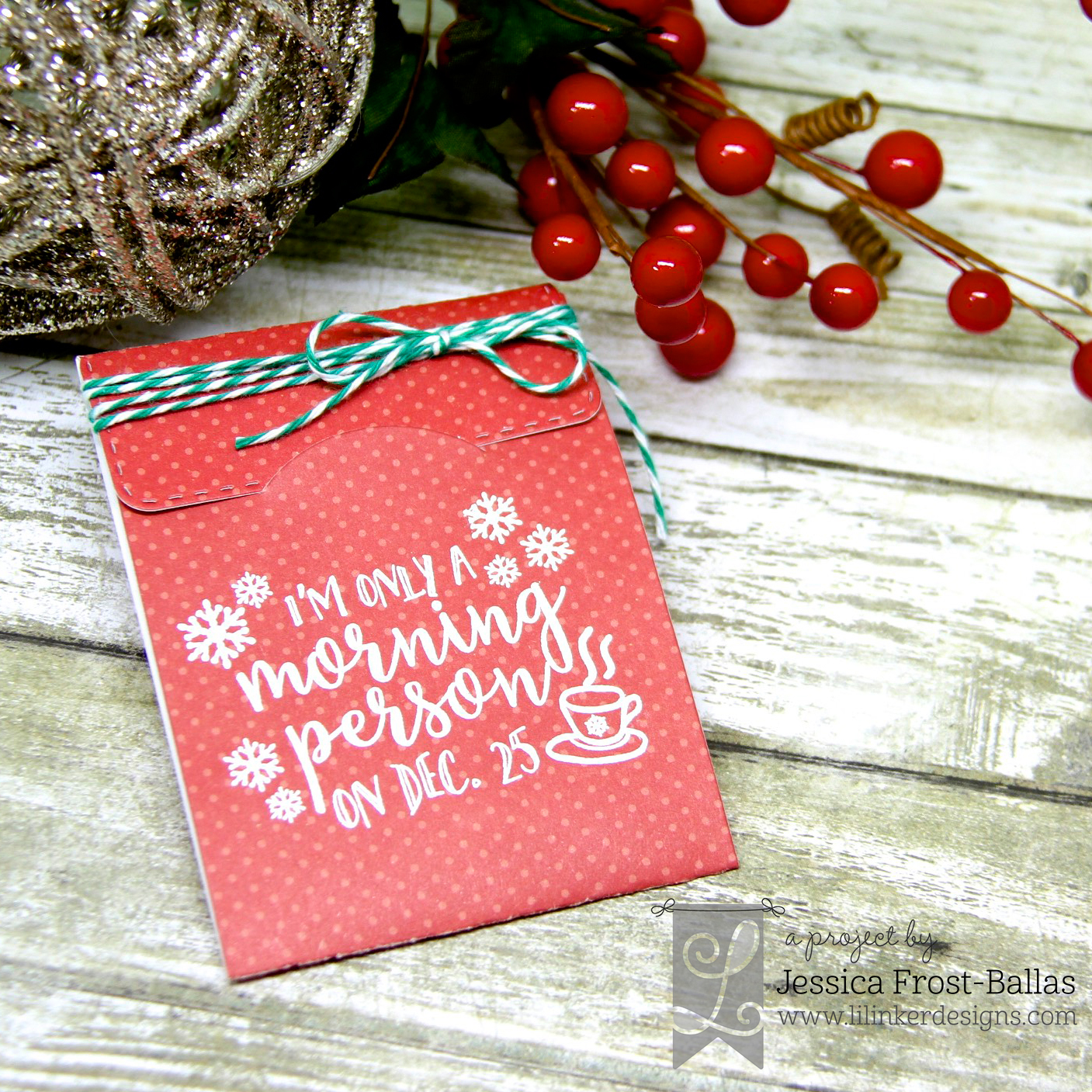 My last tag is a super easy tag that’s quick to create for a last minute Christmas gift! I’m a big fan of gift cards (especially coffee gift cards) and this sentiment from All the Christmas You’ll Need is perfect! I die-cut the gift card with patterned paper and then stamped the sentiment on the front with versamark before heat-embossing it with white embossing powder. Finally I added a little green and white baker’s twine to add a little color and texture!