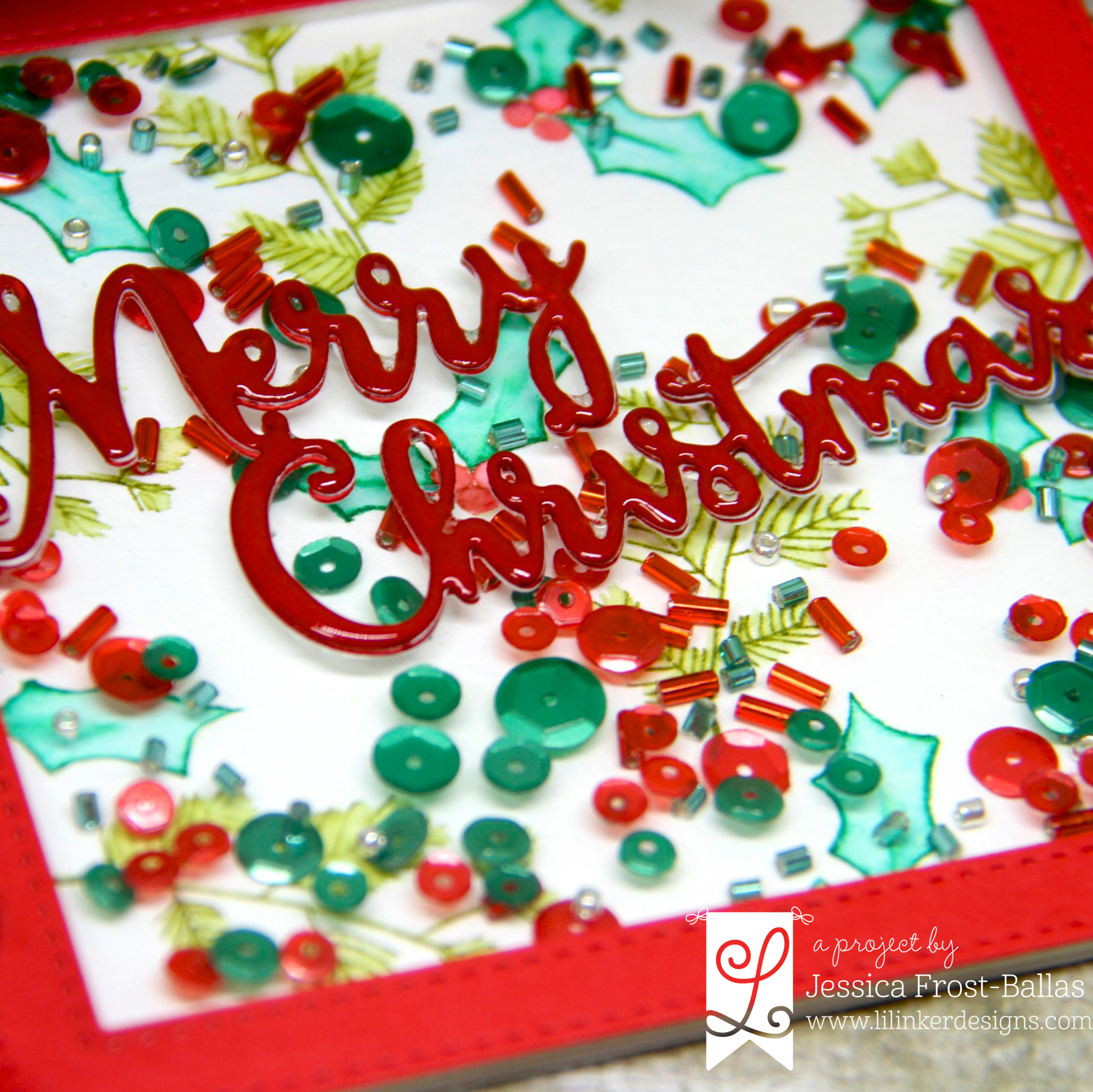And, of course, I couldn’t do a release without a shaker card! I stamped the pine bough and holly leaves and berries from Rustic Christmas onto watercolor paper with distress ink and then blended them out with a damp paintbrush. I die-cut a square frame from red cardstock, adhered acetate behind the frame, and filled it with sequins and beads before sealing the shaker with the watercolor panel. Finally I die-cut the Merry Christmas word die from red cardstock, pressed a versamark pad all over it, and heat-embossed it with ultra high embossing powder to create a dimensional sentiment. I used glossy accents to adhere the sentiment to my shaker to finish the card.