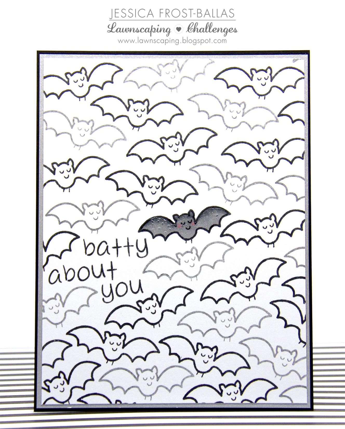 I started off by spelling out and stamping my sentiment with Jessie’s ABCs. I actually used only Memento Tuxedo Black ink for all of the stamping on my card. I started stamping my bats around the sentiment and kept moving out from the sentiment. I stamped the lighter bats by stamping the bats twice. The second generation stamping was perfectly clear just a tad lighter! Once all the bats were stamped I trimmed my panel and then added a silver cardstock frame. Then I adhered it to a black card base, colored one of my bats with copic markers, and added a little wink of stella and glossy accents!