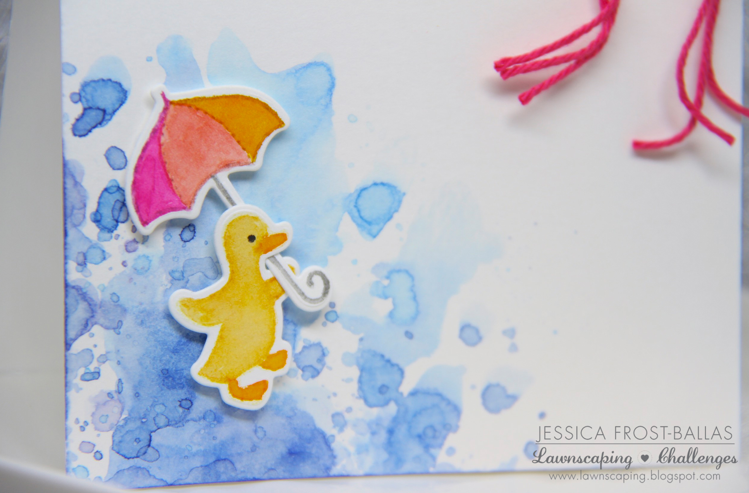 A very cute card. I love the watercolored water and the cute duck with an umbrella. TFS