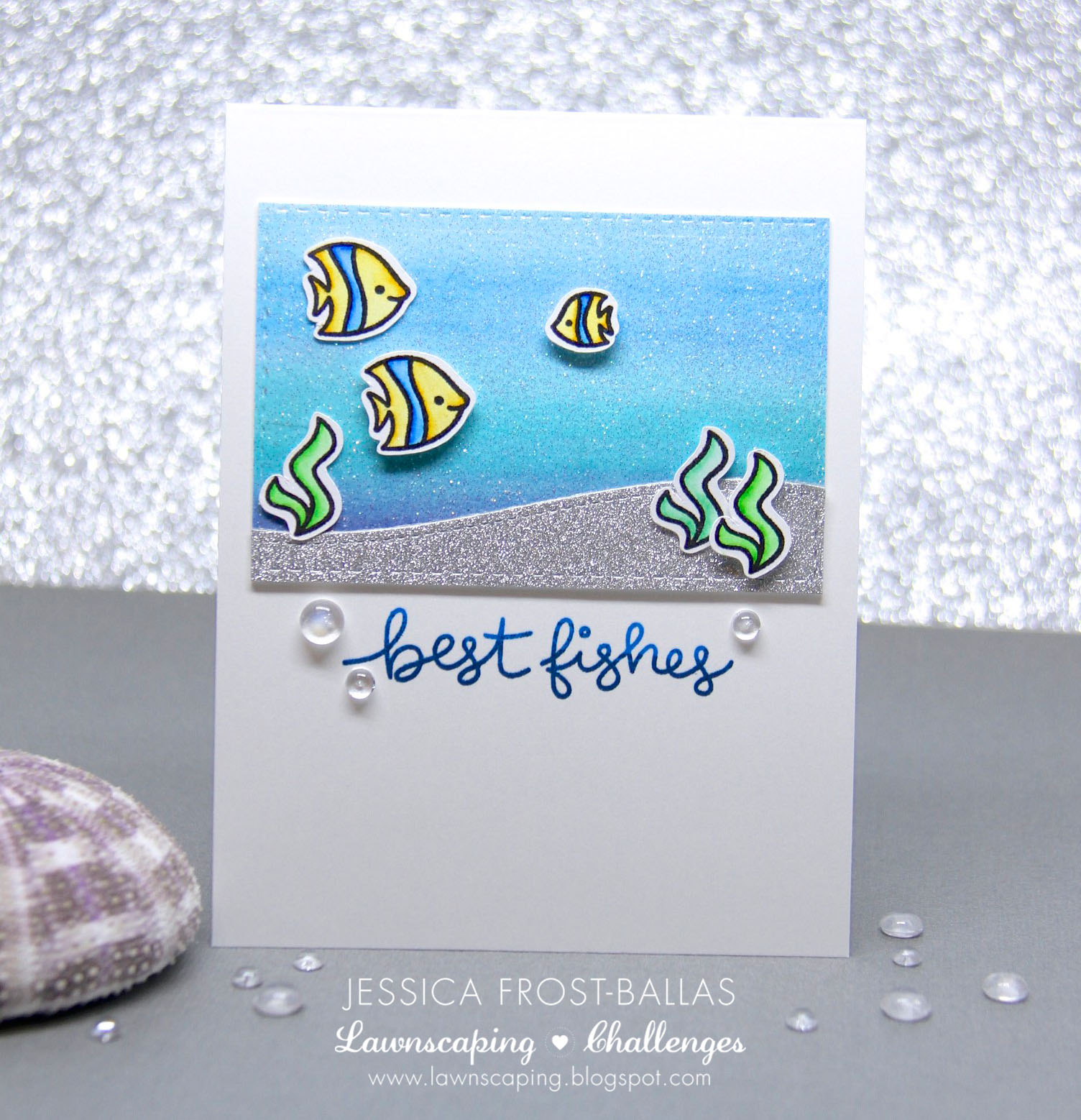 I started by painting salty ocean, peacock feathers, and mermaid lagoon distress ink onto a piece of watercolor. Once it was totally dry I inked it with versamark and heat-embossed it with holographic embossing powder. Next I stamped the fish and scenery onto watercolor paper with versafine and heat-embossed them with clear embossing powder. I colored them with zig clean color real brush markers and blended them with a spectrum noir clear sparkle brush. Next I die-cut silver glitter paper to create sand for my aquarium and adhered all of the elements together. I used my MISTI to ink the sentiment with two different Lawn Fawn inks and finished it with a few clear droplets.