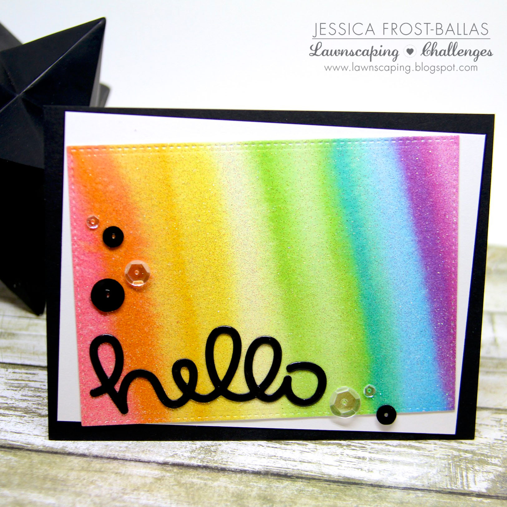 I wanted to keep it simple and really focus on the rainbow aspect! I started by smooshing distress inks onto a craft mat, liberally wet a piece of watercolor paper, and then painted the distress inks onto the paper overlapping the colors so they would blend together. I let it dry naturally and then pressed a versamark pad all over the paper. Next I heat-embossed it with holographic embossing powder and then die-cut it with a stitched rectangle die. I layered the rainbow panel onto white cardstock and then adhered it to a black card base. I die-cut the Scripty Hello from black cardstock and heat-embossed it with ultra high embossing powder for a glossy look. I adhered the die-cut word to the rainbow panel and then added a sprinkling of glossy black and sparkling clear sequins!