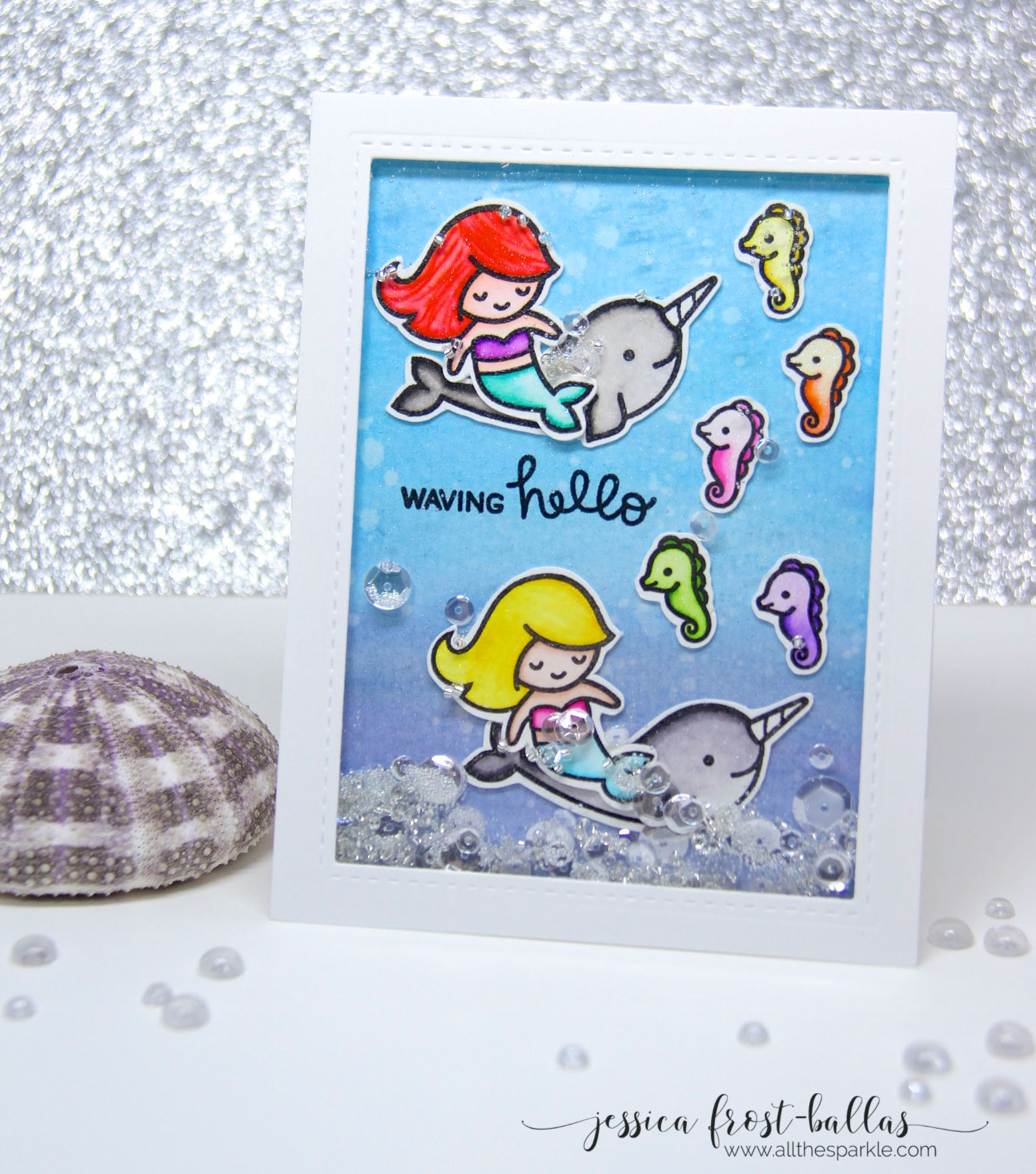 When I first got my mermaid set I stamped a ton of mermaids and sea creatures with versafine and heat-embossed them with clear embossing powder onto watercolor paper. Then I spent an afternoon watercoloring them with my Mijello Mission Gold watercolors before cutting them out with my ScanNCut. Most of my sea creatures went to my Lawnscaping card but I did have a few leftover for my shaker! For this card I started by painting the background with distress inks. I used Salty Ocean, Mermaid Lagoon (of course!), and Chipped Sapphire distress inks. I also added flicks of water to create subtle bubbles throughout my background panel. Next I added my mermaids and their pet narwhals and a small herd of colorful seahorses with foam mounting tape. I stamped the sentiment with versafine and heat-embossed it with clear embossing powder.
