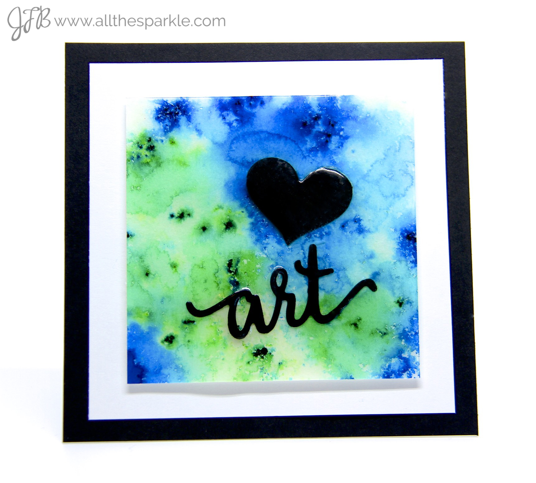 Then I went in a TOTALLY different direction for my second card! 🙂 I started off by die-cutting the heart and sentiment from Maya Road with black cardstock. I used the Tool-It-All to poke through the holes in the dies to release the cardstock easily! I set that aside and then started working on the background of my card. I wet a square of watercolor paper and then sprinkled it with Pthalo Green and Ultramarine Blue Color Burst Powders. I used a little more water on this card because I wanted the overall look to be softer and more blended. Next I applied versamark all over the square and sprinkled it with ultra high embossing powder. I heated that and then repeated the process once more. Ultra high embossing powder has really large granules and usually requires more than one application for a smooth coverage. After the second application I used a little Stick-It Adhesive to adhere the die-cuts to the embossed surface. Then I added two more layers of versamark and ultra high embossing powder. The powder sealed in the die-cuts and the finish is really smooth! I added a white cardstock frame and then mounted the panel to a top-folding black cardbase! It’s a really pretty art piece and I have two students already fighting over who gets to keep it! 😉