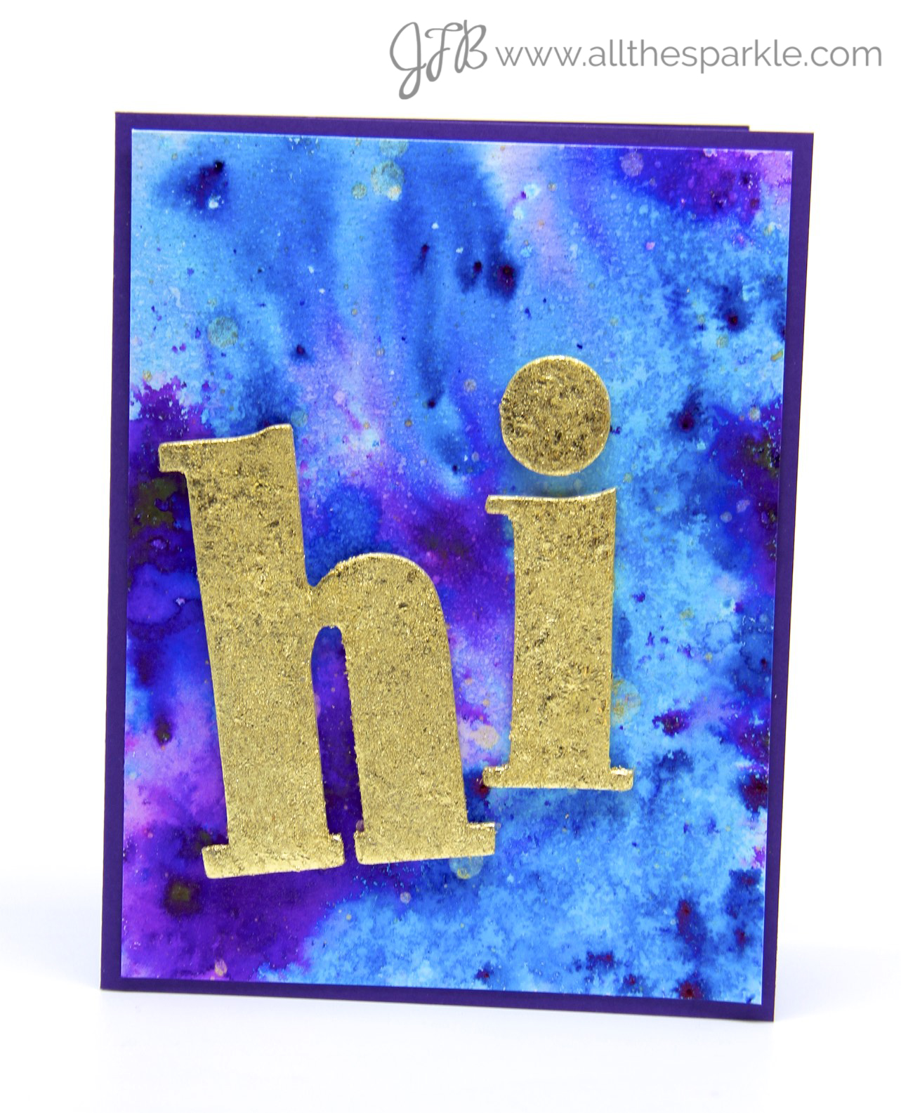 To create the background I sprinkled Ultramarine Blue and Violet Color Burst Powders onto a piece of watercolor paper and spritzed it lightly with water. Once the powder started to dissolve I tilted the paper around to help the colors blend. I let it air dry and then spritzed on some gold spray. Then I added a little more Stick-It Adhesive to the back of the chipboard pieces and adhered them to the watercolor panel. Finally I mounted the watercolor panel to a side-folding purple cardbase. I love the texture of the gold leaf and how it kinda matches the look of the Color Burst powder!