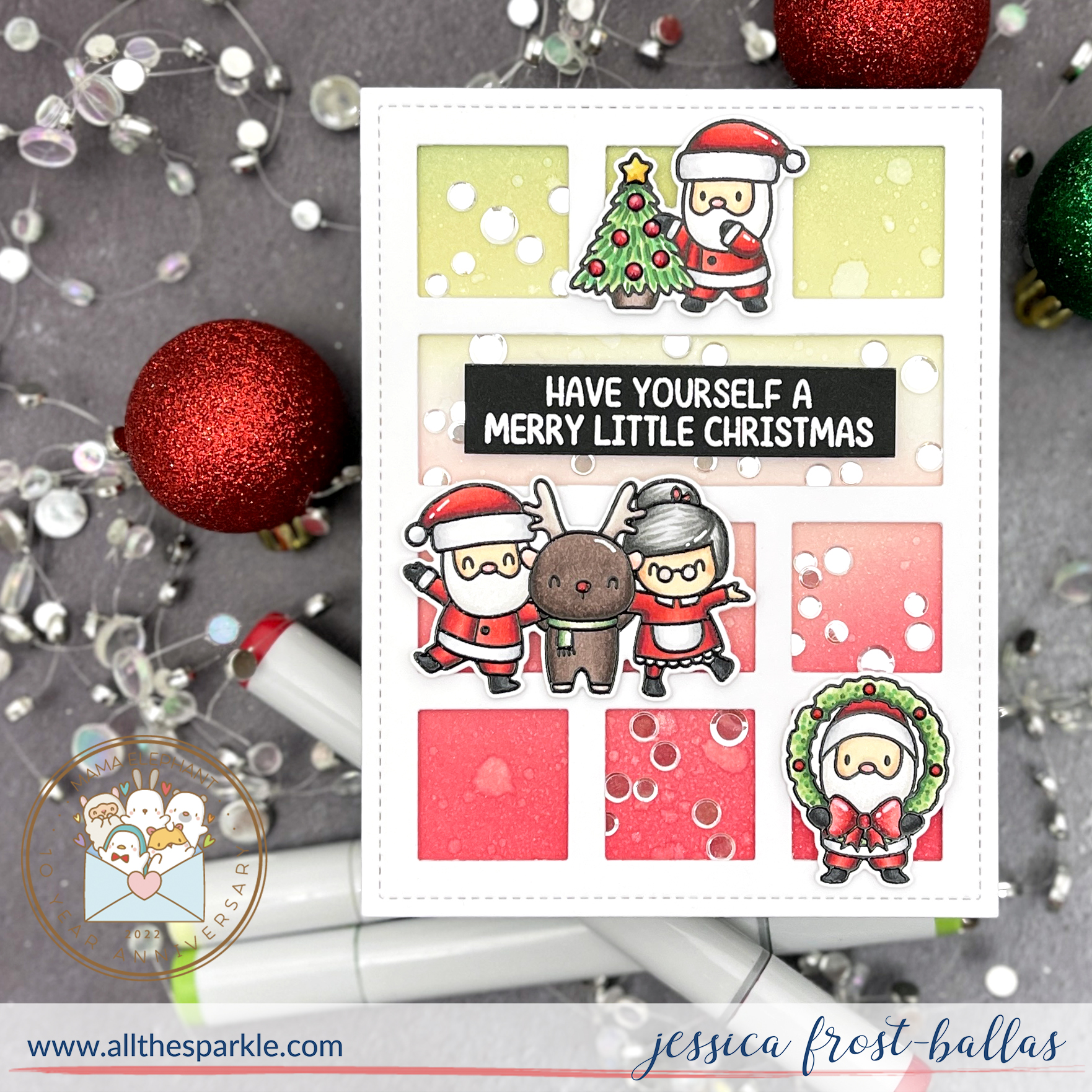 To start, I stamped a bunch of the adorable images from Secret Santa and colored them with copic markers. I die-cut them with the coordinating dies and also die-cut the Grid Windows die from white cardstock. I cut two of the segments of the grid window panel apart to create an area for my sentiment. Then I stamped a sentiment from Secret Santa onto black cardstock and heat-embossed it with white embossing powder before trimming it down to a thin label.