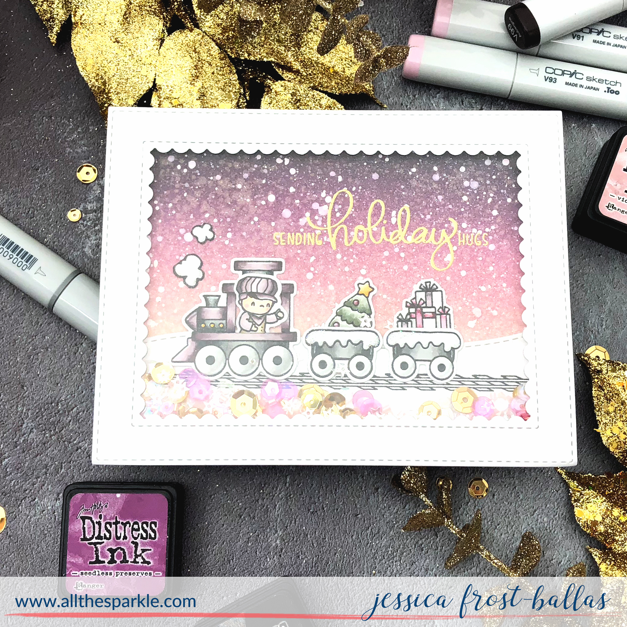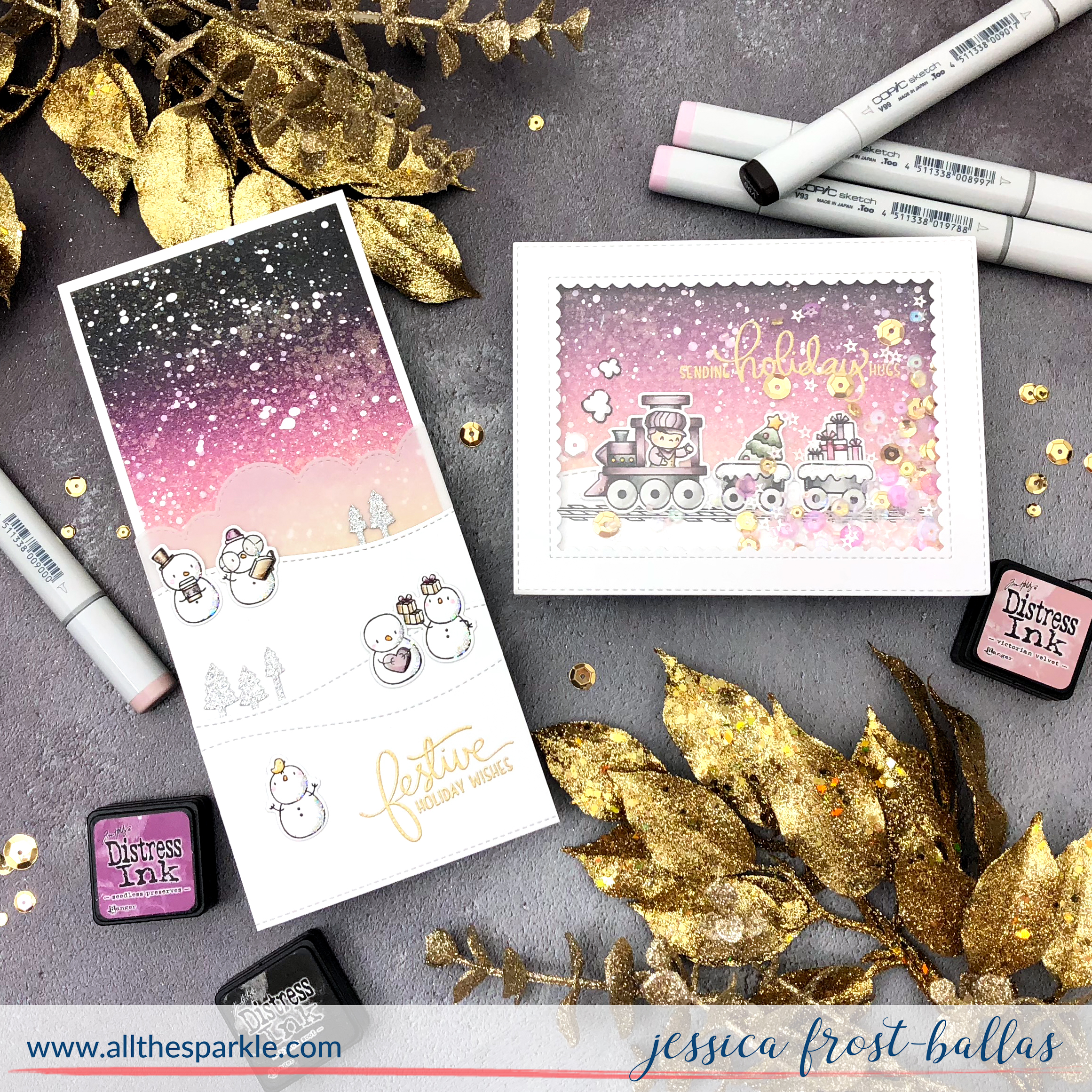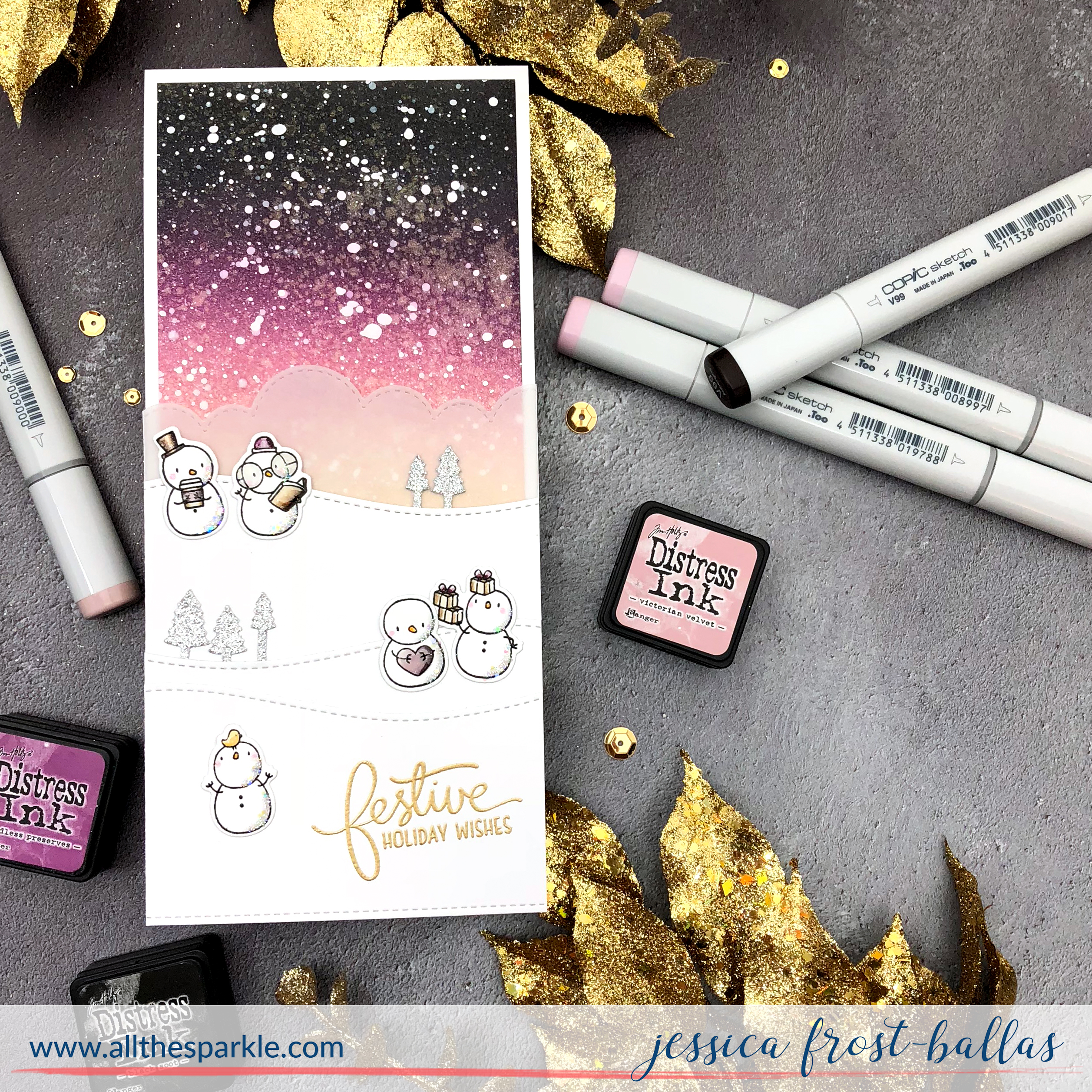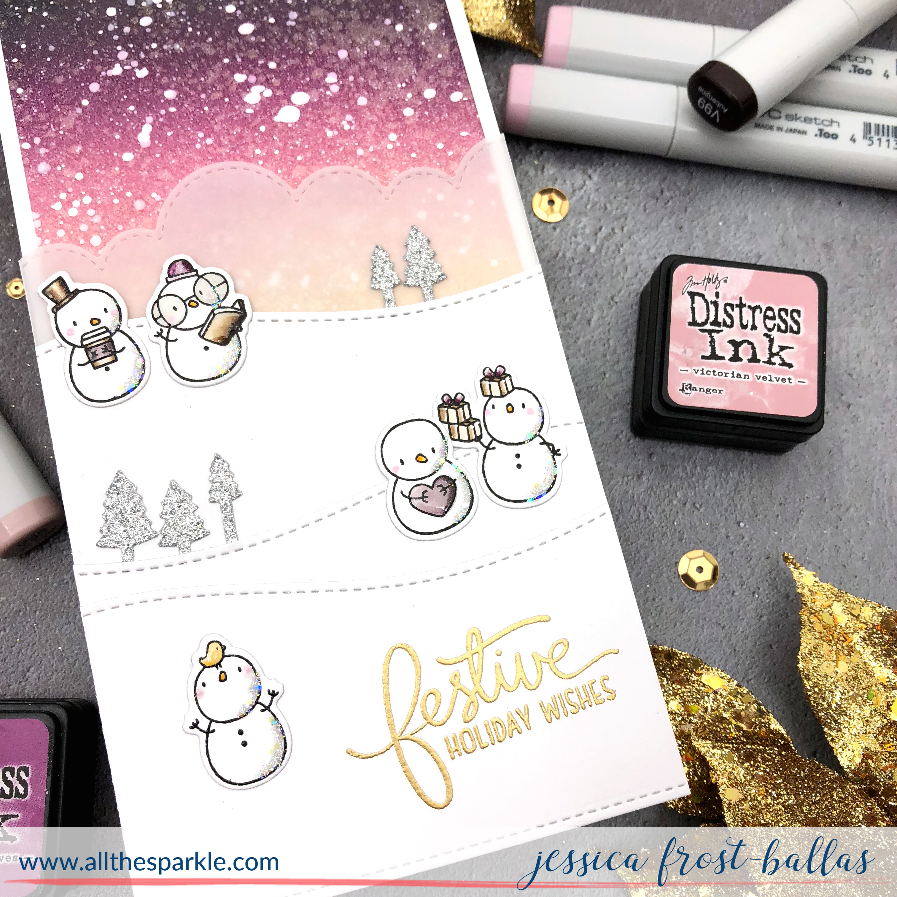 My first card uses Little Snowman Agenda! I stamped the snowmen with versafine, heat-embossed them with clear embossing powder, and colored them with copics before die-cutting them with the coordinating dies! I added a few accents with a white gel pen, spectrum noir clear sparkle, nuvo crystal glaze, and a little glitter! Next I blended antique linen, victorian velvet, seedless preserves, and black soot distress ink onto a piece of 3.5″ by 8″ strathmore bristol cardstock. I flicked it with water, iridescent gold spray, and white acrylic paint to create a dimensional snowy sky! When it was dry I adhered the distress inked panel to a white card base measuring 3.75″ by 8.”