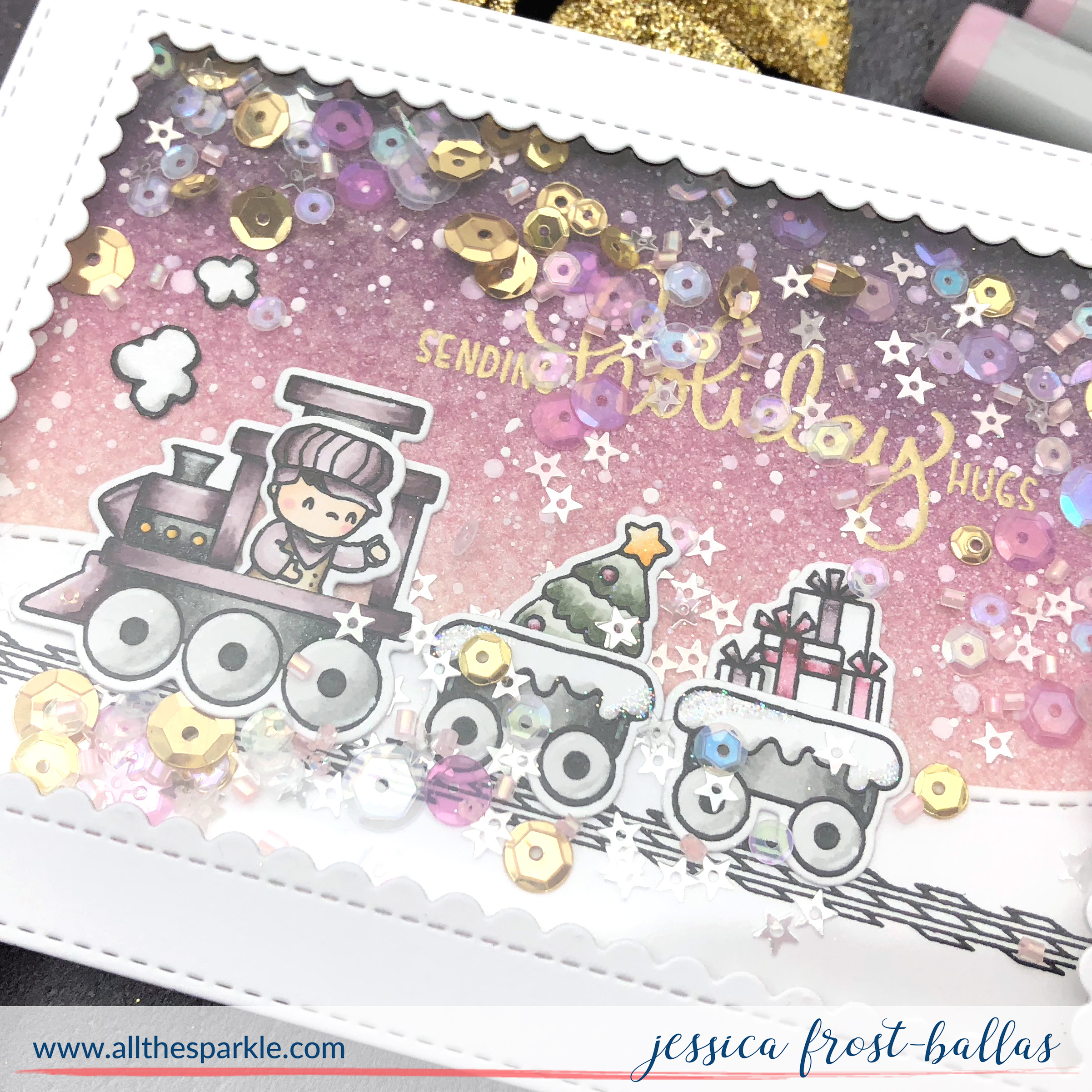 Next I die-cut the clouds from the On the Hills die set with vellum and then die-cut three snowy hills from white cardstock using the same die set. I layered them and adhered them to the distress inked panel. I also die-cut a few of the trees using silver glitter cardstock and tucked them under the hills. I stamped the sentiment from Jingle Greetings onto the lowest hill with versamark and heat-embossed it with gold embossing powder. Finally I added my little snowmen to the scene. I love the variety of snowmen in the Little Snowman Agenda set and I picked a few who (VERY) closely represented some of my very best crafty friends! 😉 They’ll know who they are!