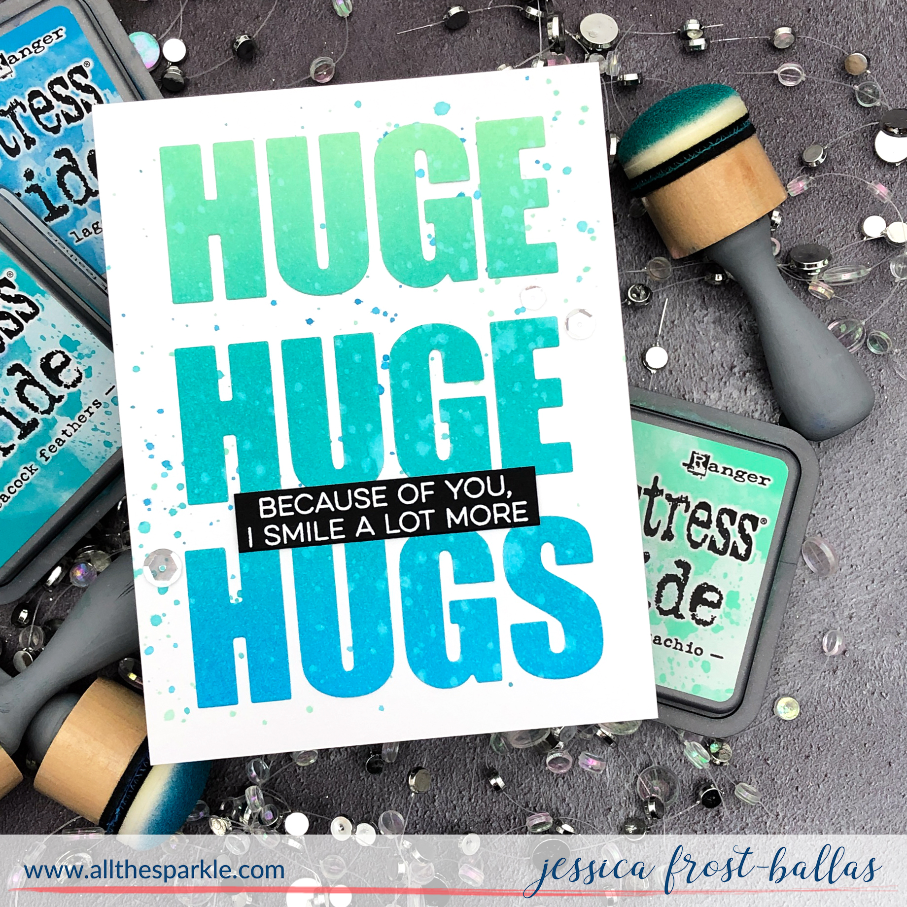 To start I blended a panel of cracked pistachio, peacock feathers, and mermaid lagoon distress oxide ink and splattered it with water before blotting off the excess. I also sprayed it with shimmer spray. Once it was dry I die-cut it with the sentiment (and die-cut Huge twice to fill the panel). I reserved the die-cut letters for another card. Then I adhered acetate behind the shaker panel and built up a double layer of foam mounting tape between each word. I filled the shaker with a mix of sparkling clear sequins and seed beads in colors that match the distress inks and then sealed it with an A2 panel of white cardstock.