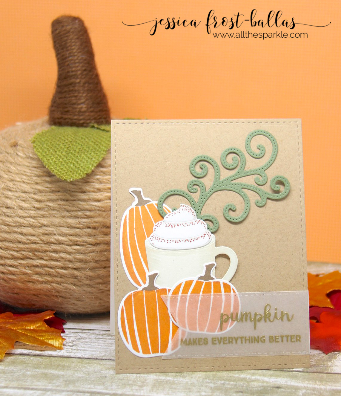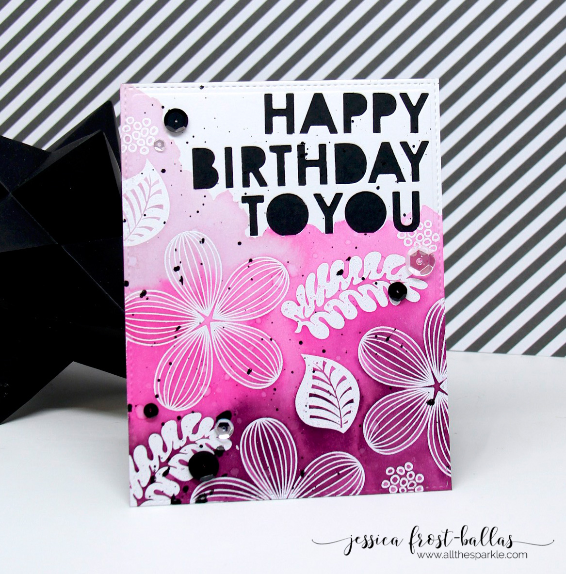 I hacked the Happy Birthday pop-up to create an open die and then added some heat-embossed Tropical Flowers and a splash of distress ink! 😉 Finished it up with a little splatter and some sequins! Hope you like it! 🙂