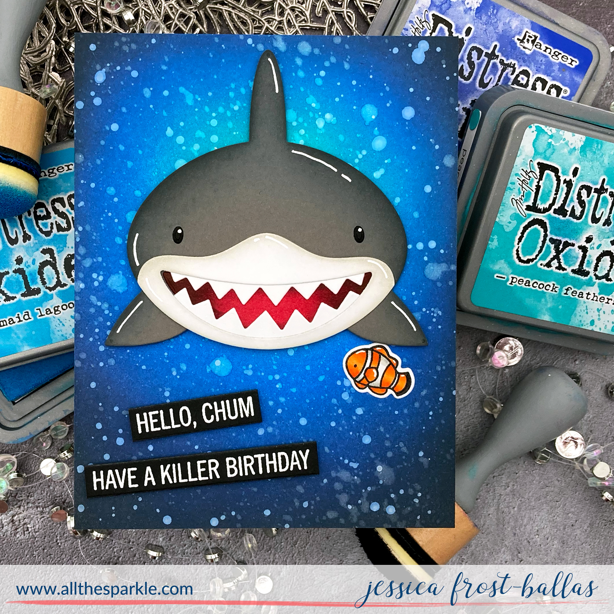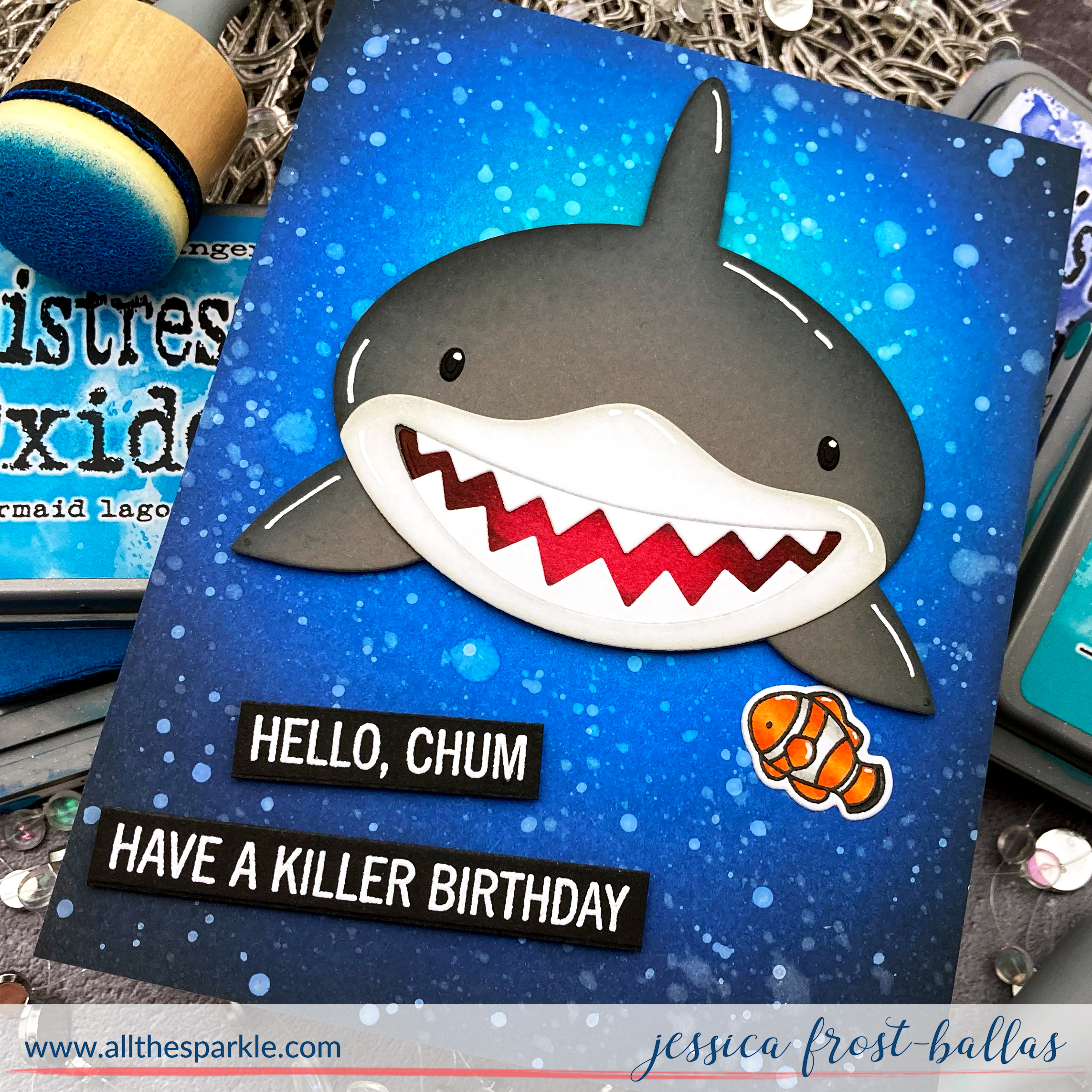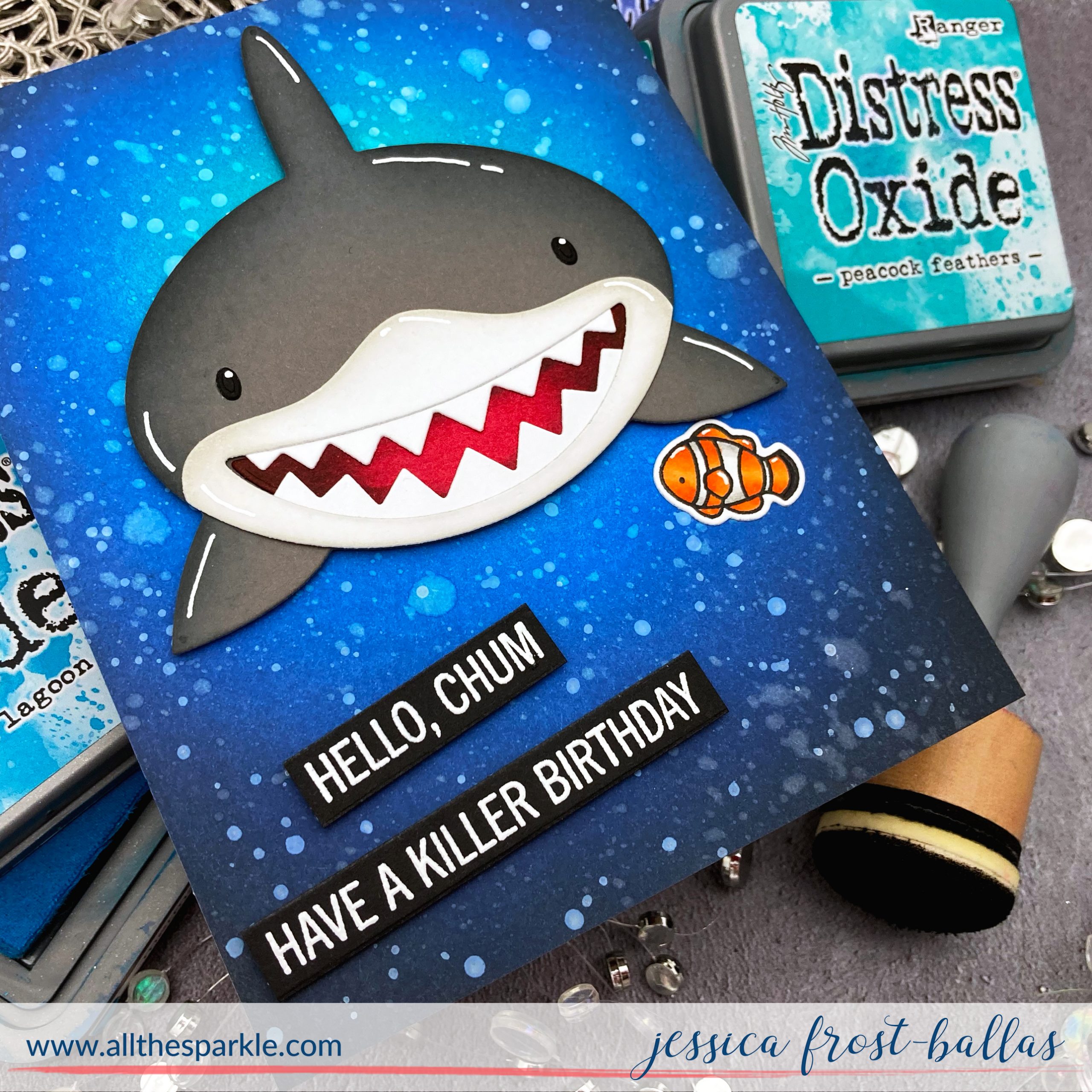 For my background I blended Peacock Feathers, Mermaid Lagoon, Salty Ocean, Blueprint Sketch, Chipped Sapphire, and Black Soot distress oxide ink onto a panel of strathmore bristol smooth cardstock. I started a little above center and blended out to the darkest colors on the edges of my panel as if the shark was swimming towards you and his tail fin was kicking up air bubbles that made it appear lighter. I let that dry for a few minutes and then I splattered the panel with water and white gouache.