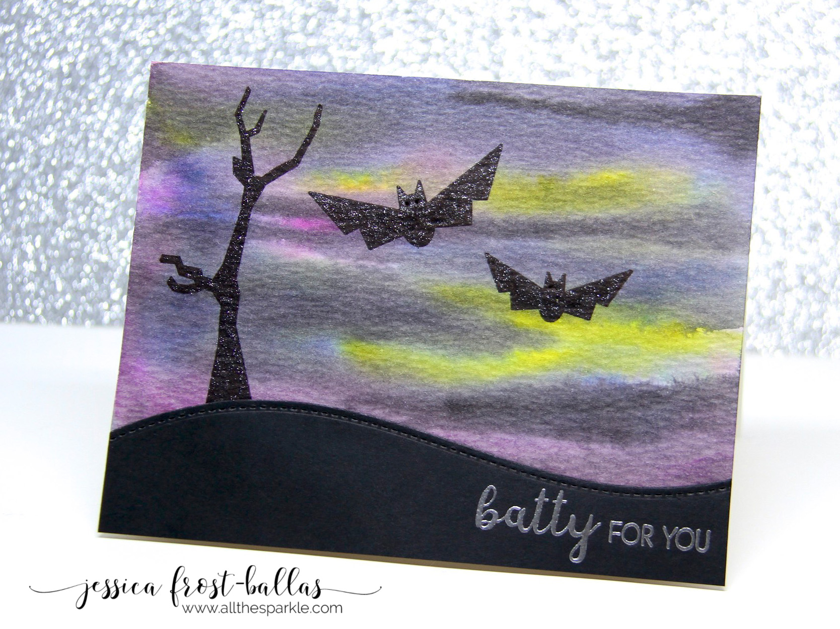 Then I stamped the two bats and tree from Spooky Sweets onto the background with Memento tuxedo black ink. I let it dry a few seconds and then went over them with spectrum noir clear sparkle so they’d be sparkly. I also die-cut a stitched hill from black cardstock, added a sentiment that I heat-embossed in silver embossing powder, and mounted it to the background panel.