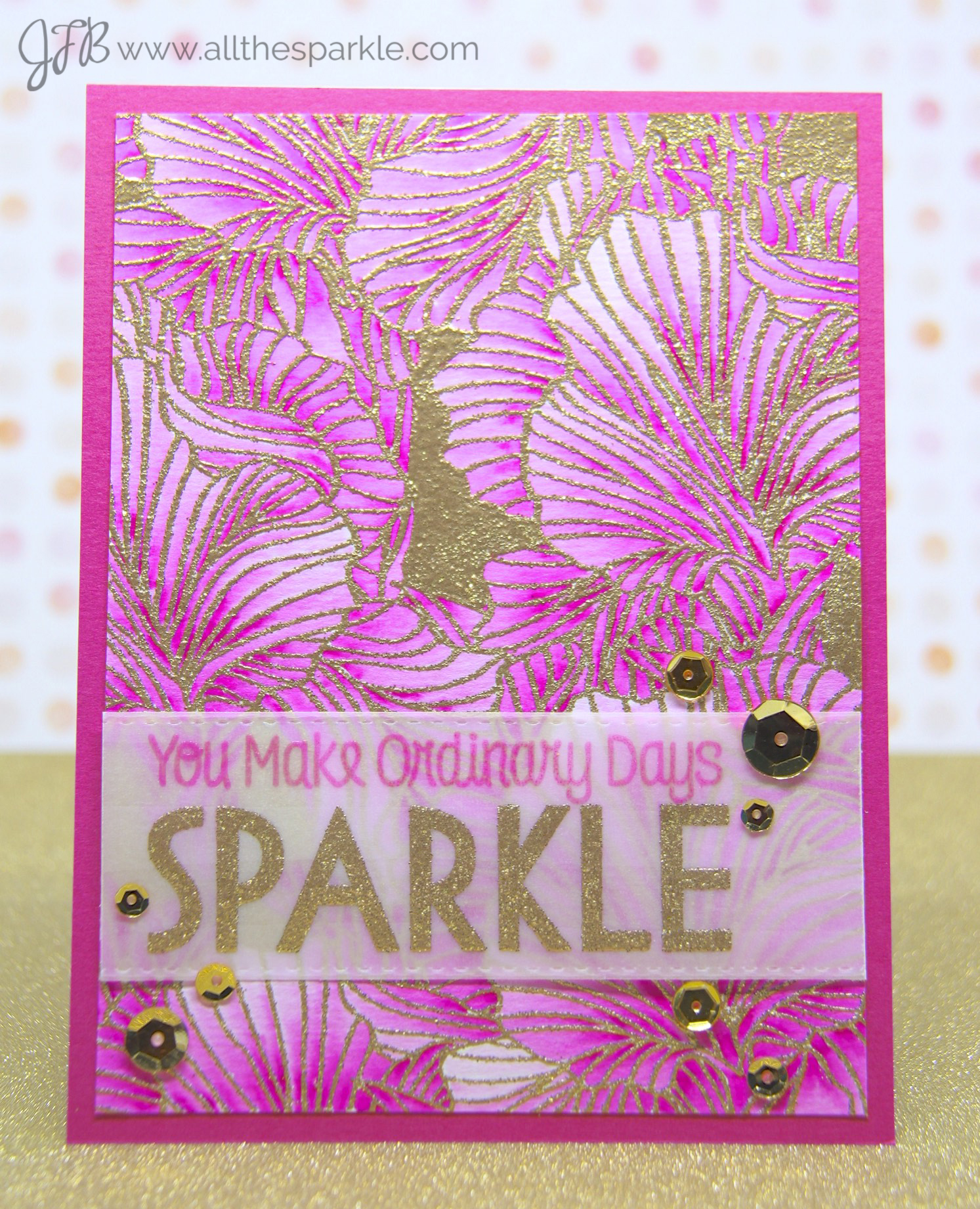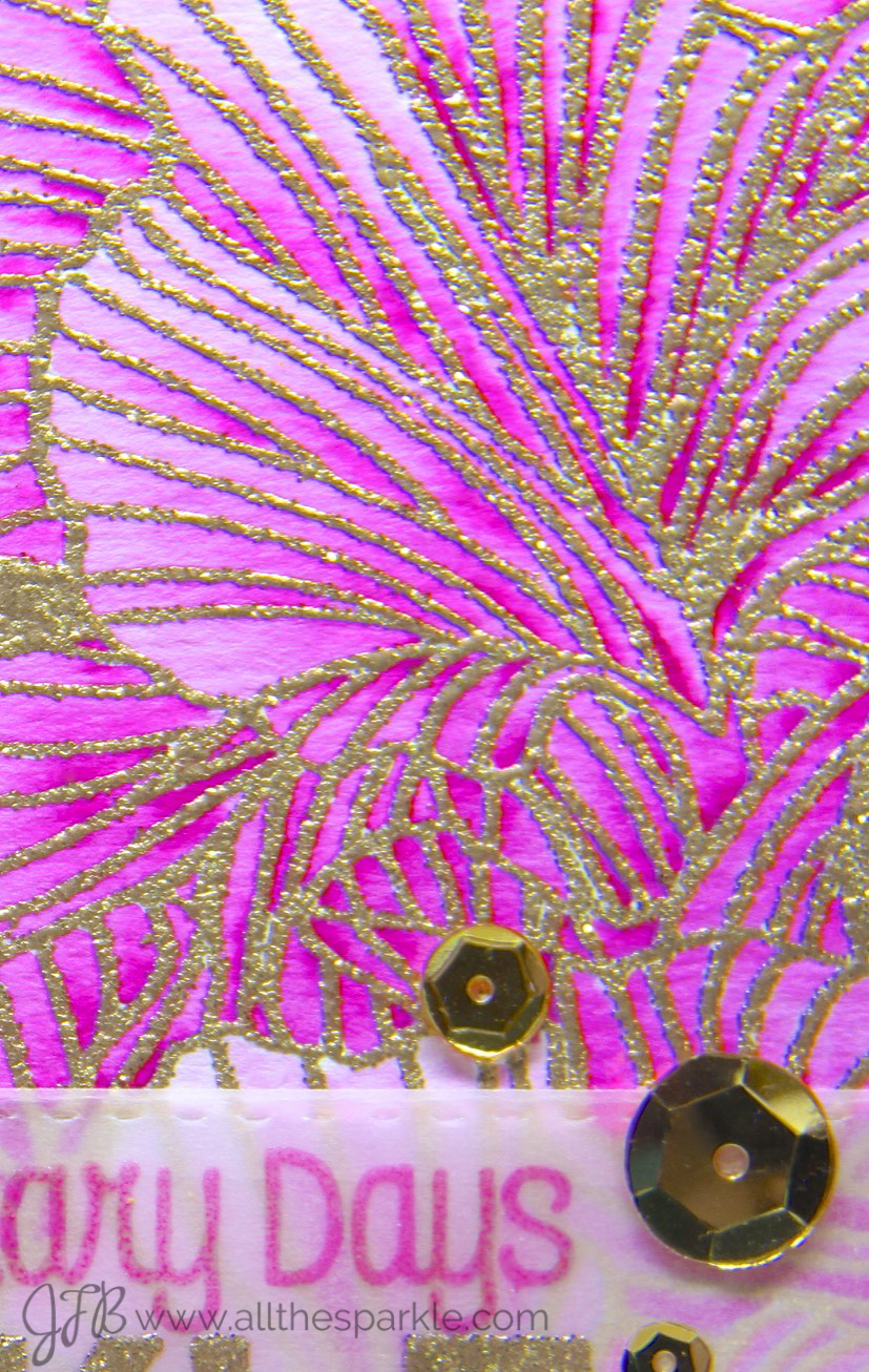 I stamped the sentiment on vellum with pink pigment ink and versamark. I embossed the top line with clear embossing powder and the bottom line with gold tinsel embossing powder. I die-cut the sentiment with the fishtail banners die but trimmed off the sides of the banner so they’d fit the background panel. I adhered the sentiment strip with vellum tape and then added a few medallion gold sequins for a little extra sparkle!