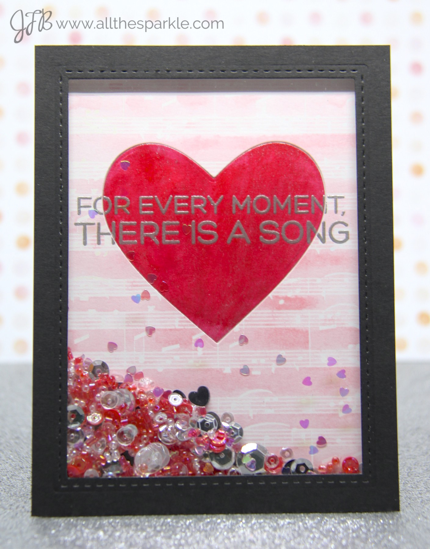 Of course I had to make a shaker card 😉 I started off by die-cutting a heart from the Heart STAX and then watercolored it with Gansai Tambi watercolors and iridescent medium. I set that aside to dry while I worked on the rest of my card. Next I stamped the Music background stamp with versamark and heat-embossed it with white embossing powder on watercolor paper. I painted the background with Spun Sugar distress ink and then let that dry. Once that dried I die-cut the same heart from the music background so I could inlay the pink heart inside. I temporarily attached them together with post-it tape and used my Misti to stamp the sentiment from Keep on Rockin’ over the heart. I heat-embossed the sentiment with Ranger silver embossing powder. Finally I cut the frame for my shaker from one of the Stitched Rectangle dies and then filled it with beads, sequins, and heart confetti in various shades of silver, iridescent clear, and pink!