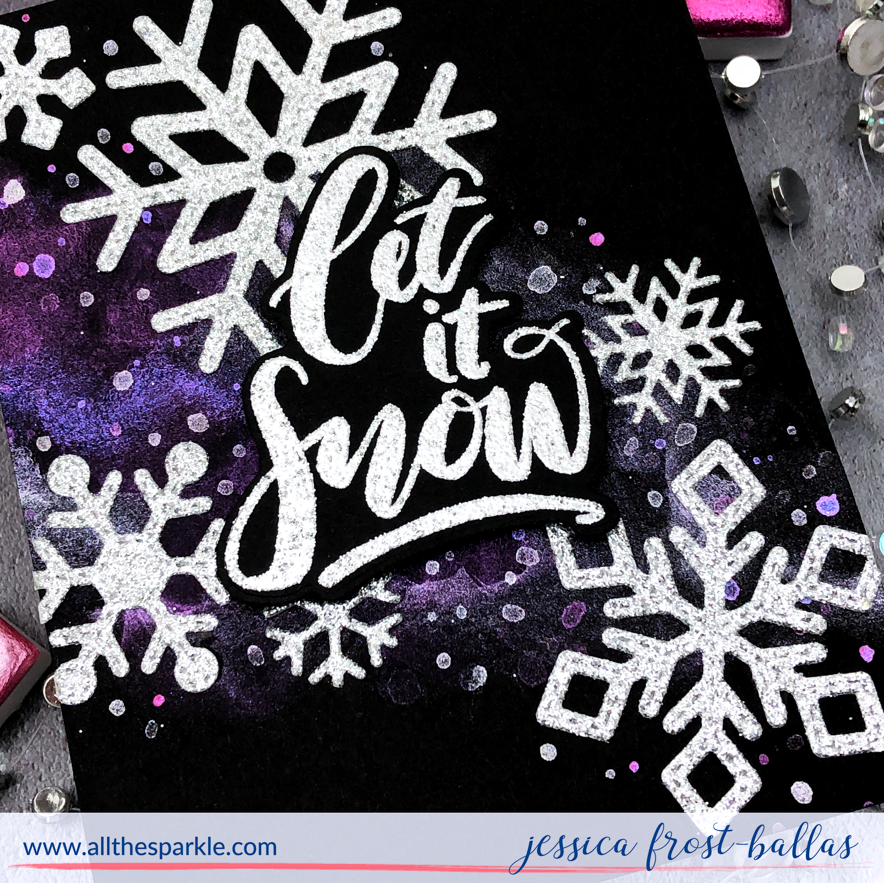 While the panel was drying I die-cut a variety of snowflakes from Lawn Fawn from silver screen glitter cardstock. I stamped the sentiment from Honey Bee stamps onto black cardstock with versamark and heat-embossed it with silver glitter embossing powder before die-cutting it with the coordinating die. Once the background panel was totally dry I adhered the snowflakes with liquid glue and then added the sentiment with foam mounting tape to finish the card! I love all the shimmer and sparkle! This is my first time using the hydracolour watercolors and I’m excited to play with them some more!