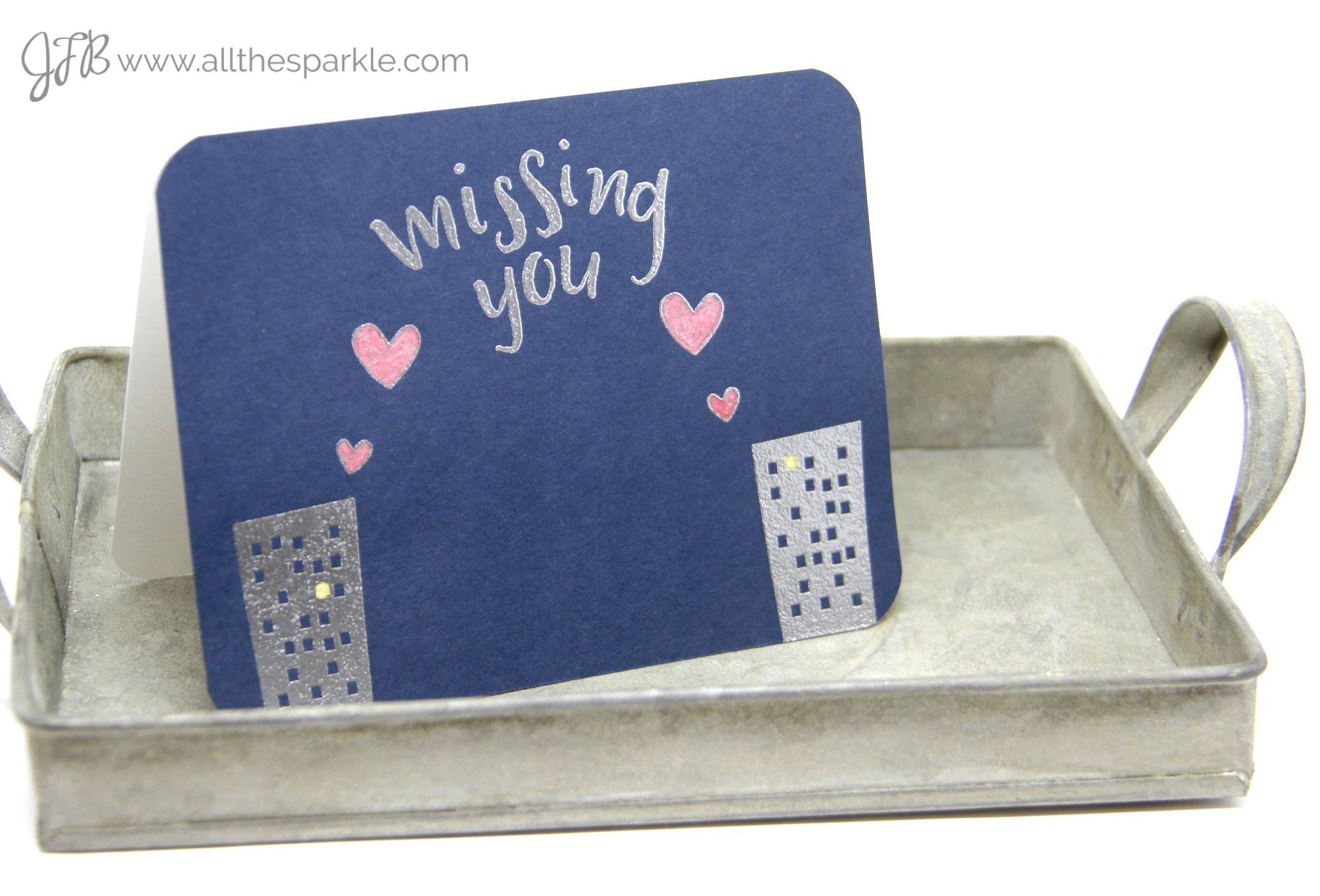 I love these cute little buildings and I thought they’d be perfect for a long distance relationship card! I stamped the buildings, sentiment, and heart outlines with versamark and heat-embossed them with silver powder. I wanted lights in the building and the hearts to stand out against the dark blue cardstock so I used my Kirirana Wink glitter markers to color them. I finished the card by adding glossy accents to the hearts and windows and corner-chomped the card. I love the bright pops of pink and yellow! So, if you haven’t checked out this stamp set or the other new stamps from Concord & 9th I highly recommend that you head over and do some shopping! 😉
