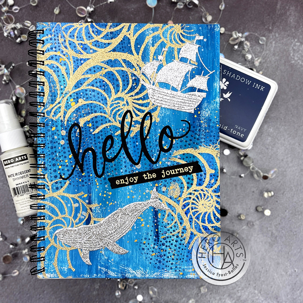 The first project I’m sharing is my first attempt at doing mixed media on a journal cover! I started by painting the journal cover with several shades of blue gouache. I let it dry completely and then sprayed it with White Iridescent Shimmer Spray and splattered it with Gold Glitter Metallic Ink. Next I stamped the Pearl Strings Bold Print stamp randomly across the cover with Navy ink. Then I also stamped the Nautilus Bold Prints stamp with Embossing Ink and heat-embossed it with Gold Glitter Embossing Powder. Finally I die-cut the Dream Accessories images with silver glitter cardstock and added a sentiment from Hello Message Fancy die and Art Journal Messages!
