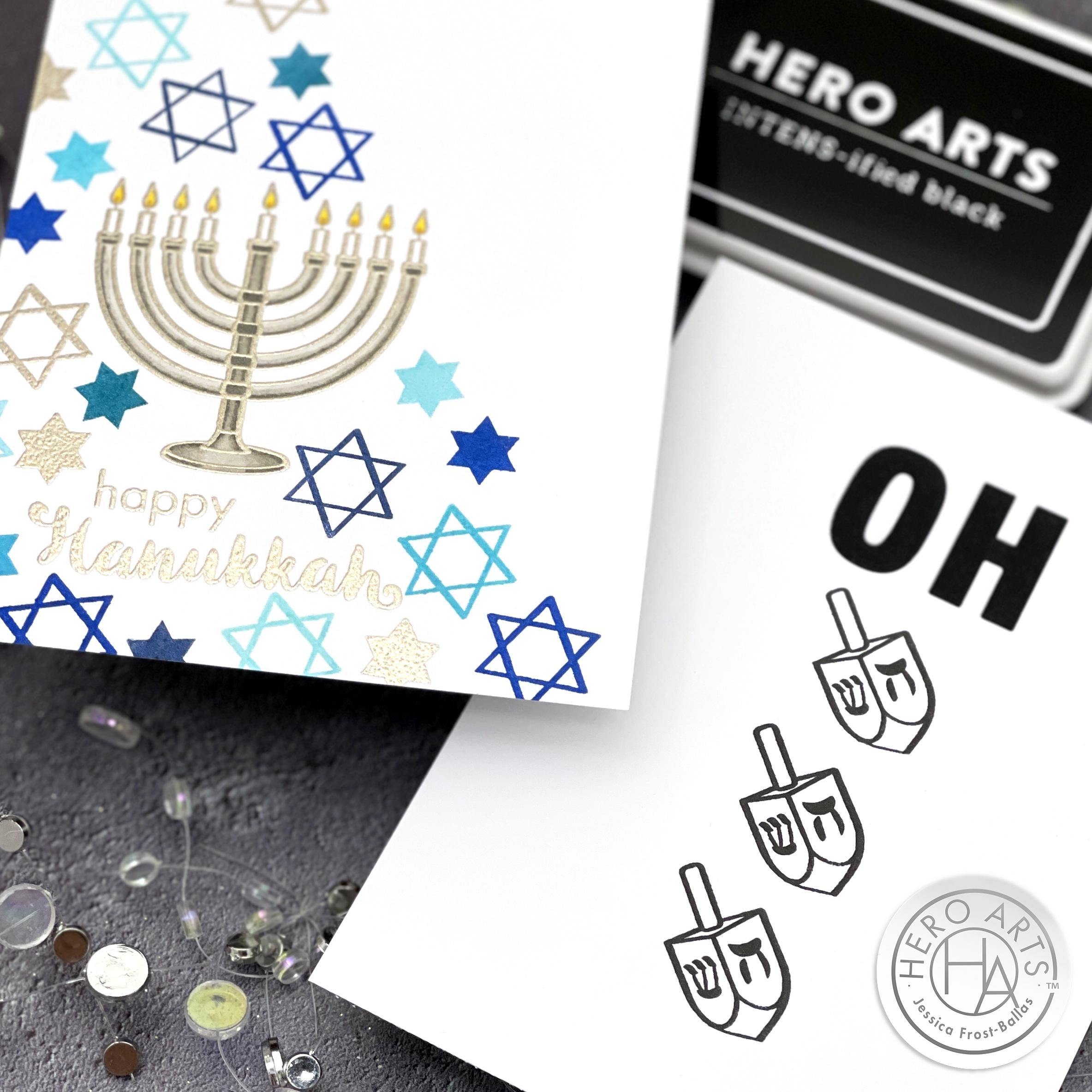 Love your cards the blue and gold is popping! The dreidel one is such a good idea. Thank You for the inspiration.