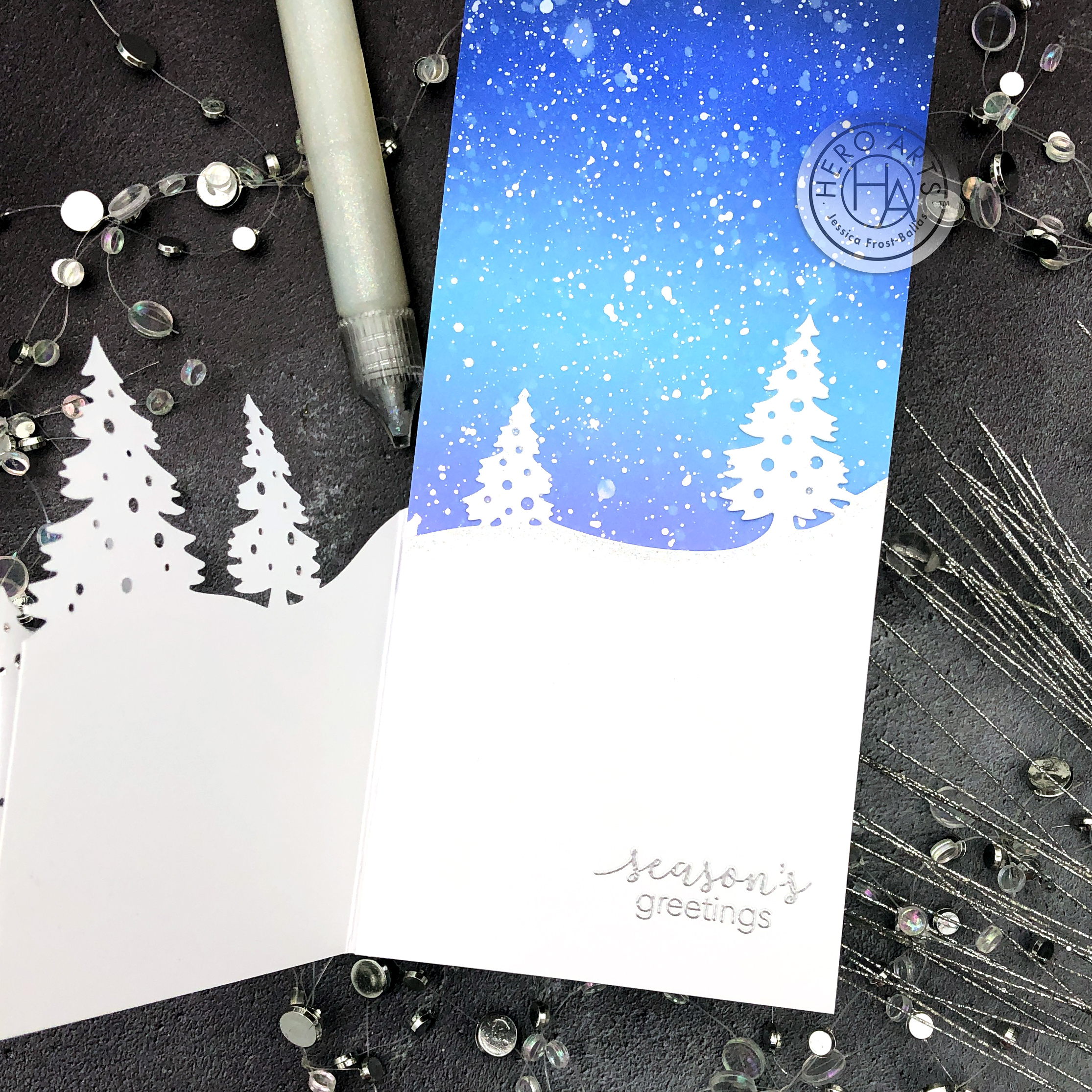 Next I die-cut the Tri-fold Edge Winter Pine Fancy Dies three times from white cardstock. I trimmed each panel down to vary the height of the pines. Then I applied a little glitter lacquer (included in the kit, and AWESOME!) to each tree and used my finger to brush it down to cover the full tree!